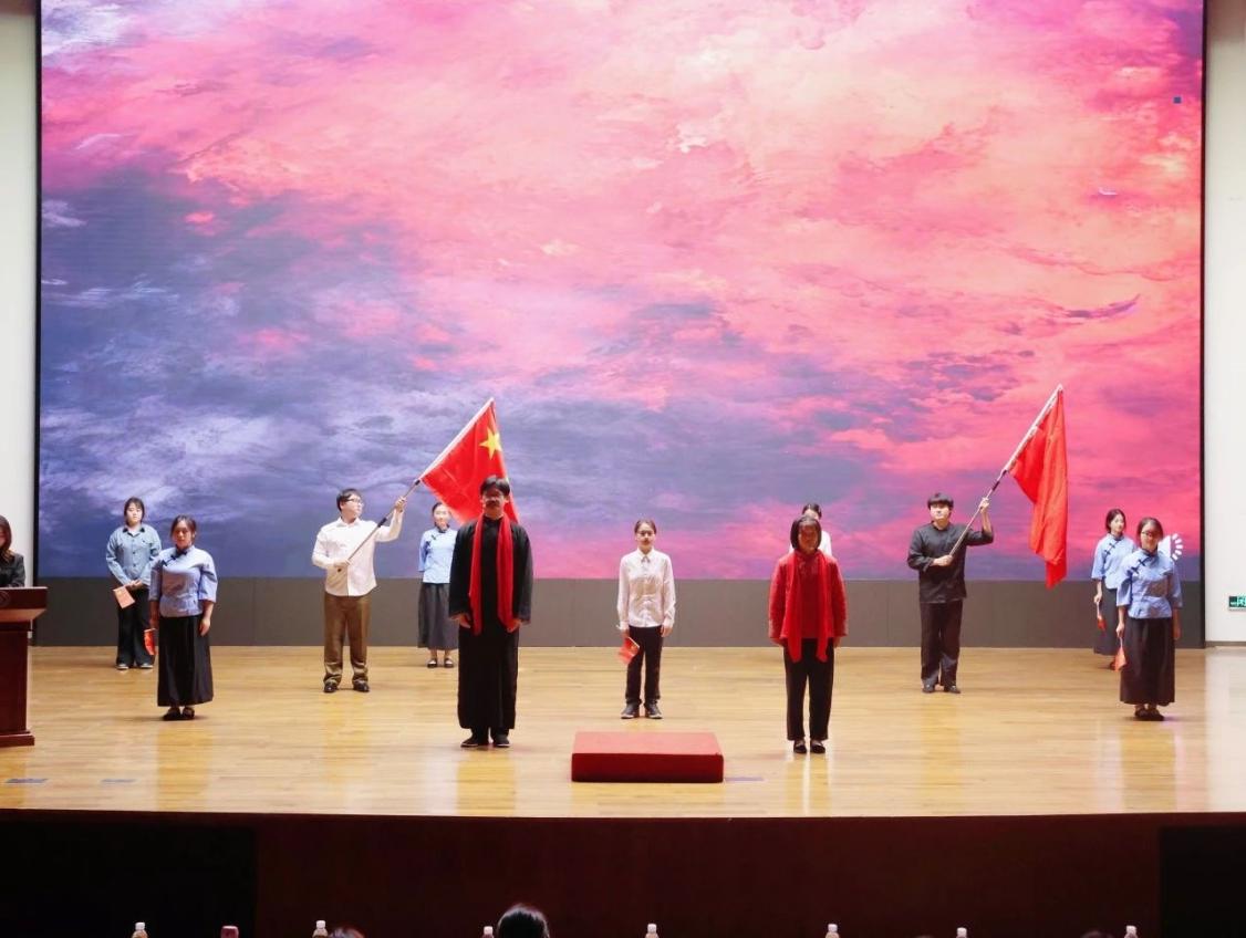 接下来各学院进行了学习汇报演出展示。此次汇报演出涵盖了“党史剧”“三馆演讲”“精神谱系”三种表演形式,每个学院都展现了精彩纷呈的表演。其中,外国语学院精心筹备的党史剧《以信仰之光,照亮青春之路》令人瞩目。该剧分为三幕,第一幕以1919年巴黎和会中国外交失败为背景,讲述了李大钊在《新青年》发表的文章激励有志青年奋进,鼓舞青年以青春之躯扛起救亡大旗。