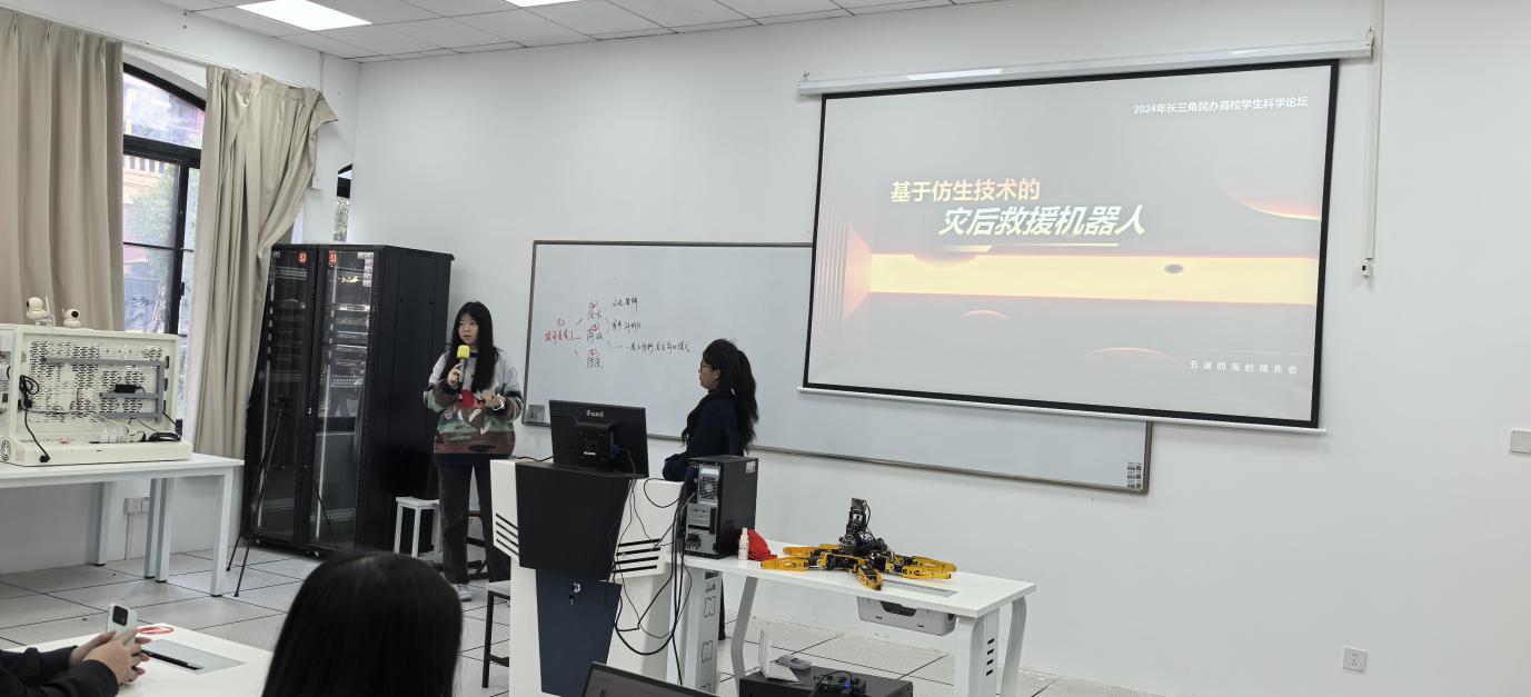 2024年11月21日下午,在信息学院128实验室,智能物联创想工作室携手未来创潮社团组织了一场《千驱行者—基于仿生技术的灾后救援机器人》项目分享会。本次活动由物联网副系主任范培英老师主持,并荣幸邀请到项目主要成员王烨、邓宝山韦琳香学长作为主讲嘉宾,为在场师生深入讲解了如何进行项目申报,组建团队成员,以及项目孵化过程。此次活动得到了物联网工程系师生的积极响应与参与,现场交流互动频繁,氛围十分热烈。