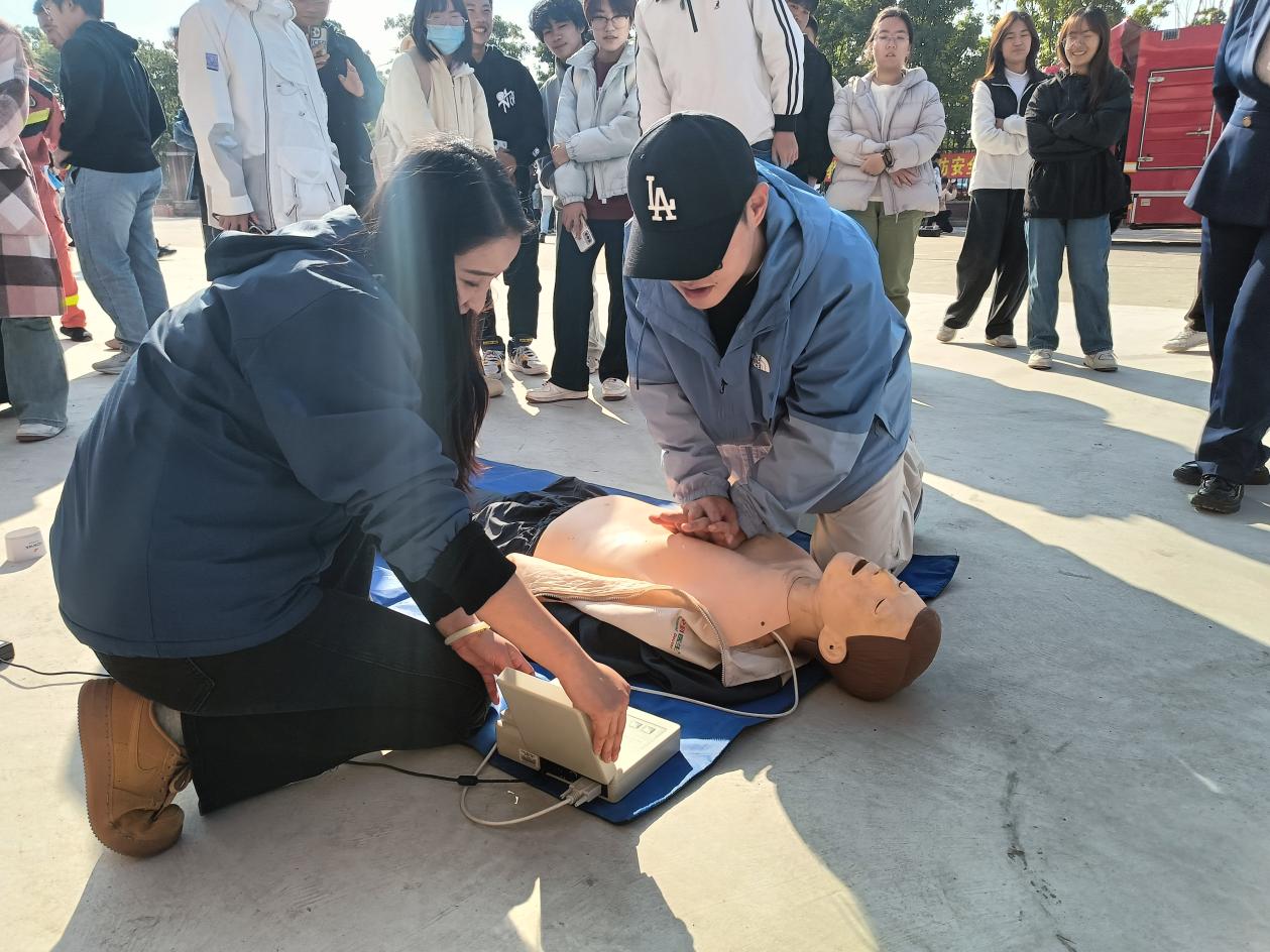 活动现场,师生们学习如何正确使用灭火器,如何在紧急情况下保持冷静,如何对昏迷人员进行心肺复苏以及如何快速疏散到安全区域。辅导员老师和学生们积极参与,认真听讲并按照指导进行实际操作,大家表现出了高度的责任感和团队协作精神。