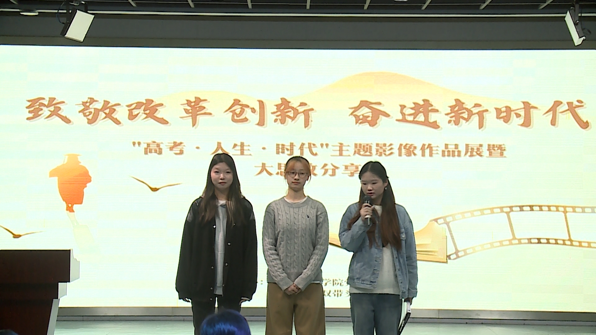 一等奖作品代表22新闻2班的刘梓欣同学生动讲述了她们团队的创作经历。她分享到,主题采访与影像制作过程切实锻炼了小组同学的专业应用能力,提升了新闻人的“四力”,与采访对象(1979级高考生陆国强)的对话交流让团队同学深刻感悟到教育对个人成长与国家社会发展的重要性。她呼吁身处新时代的同学们要珍惜正在享有的优质教育资源,认真学习,积极实践,追求卓越,为民族复兴贡献自己的力量。