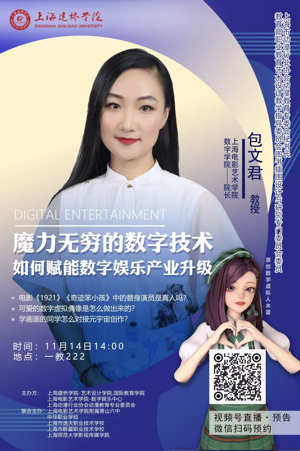 11 月 14 日,包文君教授以 “数字技术如何赋能数字娱乐产业升级” 为题,为我校数字媒体艺术专业的莘莘学子带来了一场知识的盛宴。线上线下200余人参与了此次学习与探索之旅。