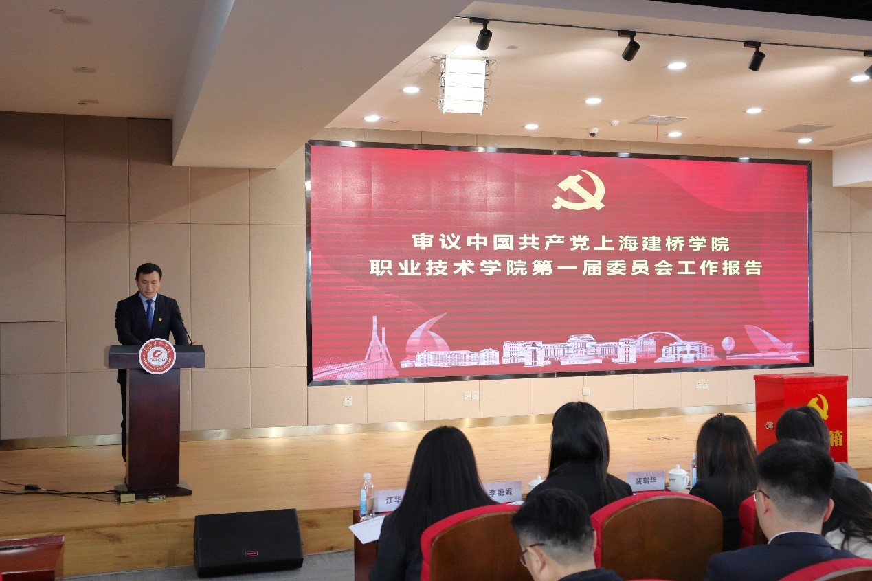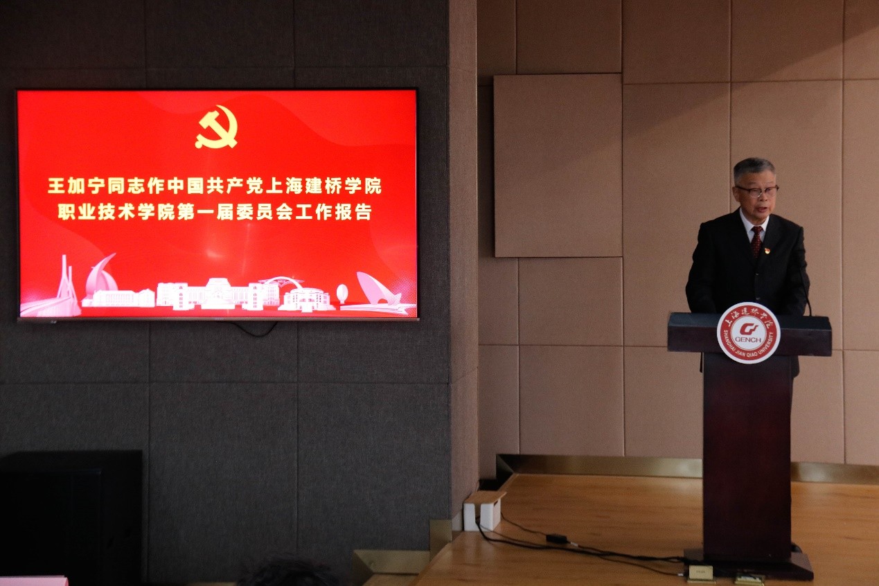 王加宁同志代表中国共产党上海建桥学院职业技术学院第一届委员会所作的题为《凝聚师生聪明才智 践行教育强国重任 为建设有特色的培育高素质技能人才学院而努力奋斗》的工作报告。王加宁在报告中指出本次大会的主题是:全面贯彻习近平新时代中国特色社会主义思想,弘扬伟大建党精神,扎根中国大地办教育,不忘立德树人、教书育人初心,牢记“为党育人、为国育才”使命,协力开拓,迎难而上,努力办好学生和社会满意、党和政府放心的职业教育。大会的主要任务是:总结本届党委会过去五年的工作,明确和部署今后五年学院发展的指导思想、奋斗目标和重点任务。大会选出了职业技术学院新一届委员会。