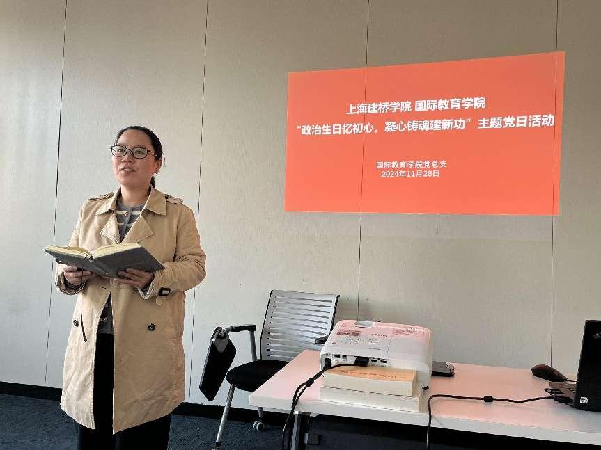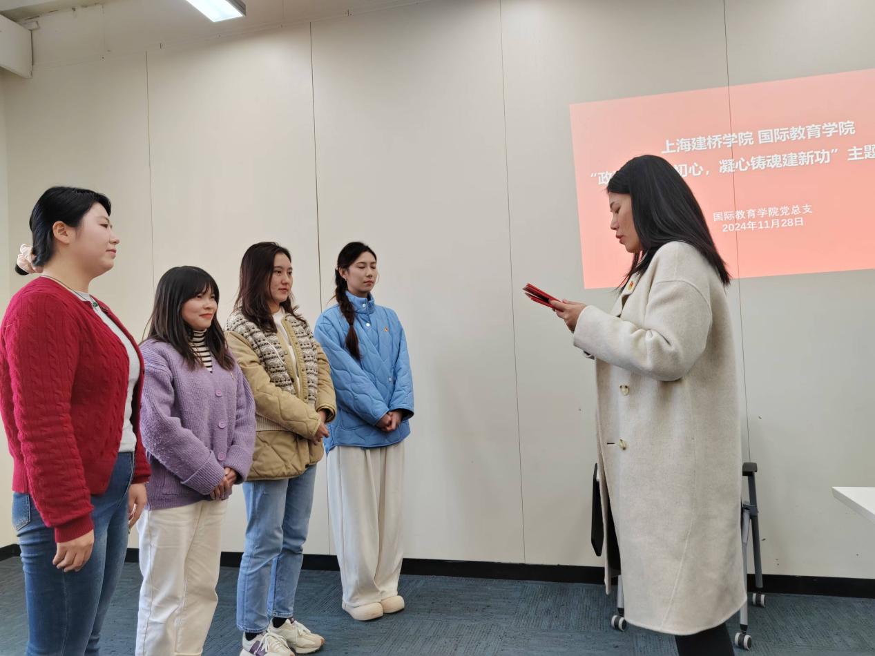为强化党员的宗旨意识、身份意识和责任意识,引导师生党员深刻感悟红色初心,汲取奋进力量,11月28日,国际教育学院在学院四楼党员活动室开展了党员“政治生日忆初心,凝心铸魂建新功”主题党日活动。学院精心设计了“五个一”的“政治生日活动,即送上一张生日贺卡、赠送一本红色书籍、观看一部党课视频、分享一段生日感言、重温一次入党誓词”,以庄重温情的政治仪式过好“政治生日”。学院党总支书记周英芬、党总支副书记徐伟、各党支部书记及曾在7月至12月入党的11名党员同志共同参加了本次主题党日活动,活动由学院总支组织委员岳会锦主持。