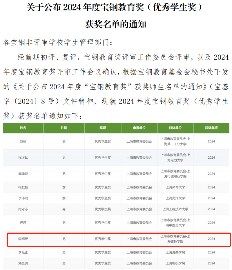 近日,2024年度宝钢教育奖评审结果揭晓,我校2020级信息技术学院计算机科学与技术专业李朔天同学获得2024年度宝钢优秀学生奖。