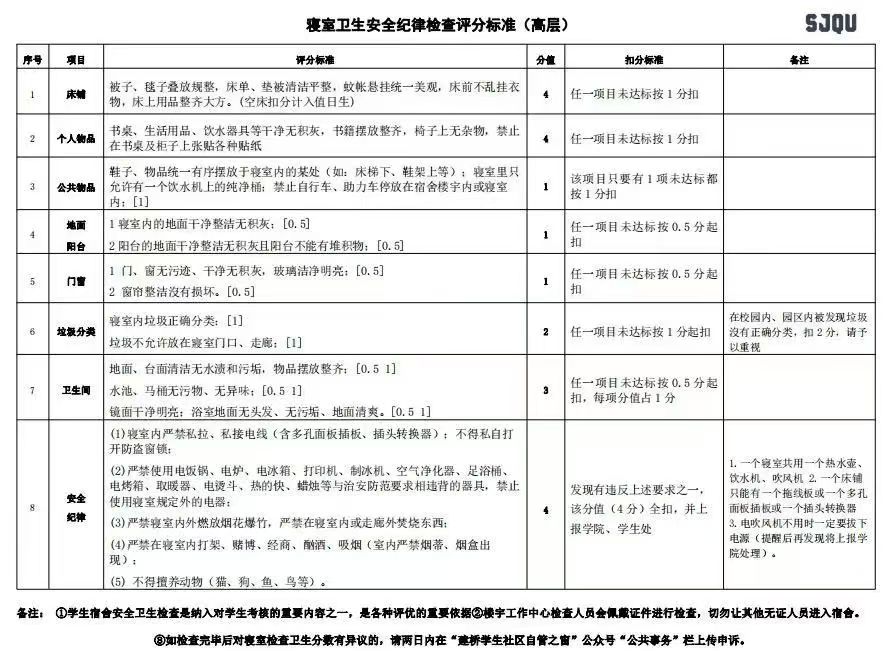 2024-2025学年第一学期寝室内务卫生常规检查将在本学期第15周结束(截至12月12日单周周四)。第16周将会对申诉寝室进行复查,值班室和晚值班老师将会一直不定期抽查违禁物品,请同学们互相转告保持寝室的干净与整洁!