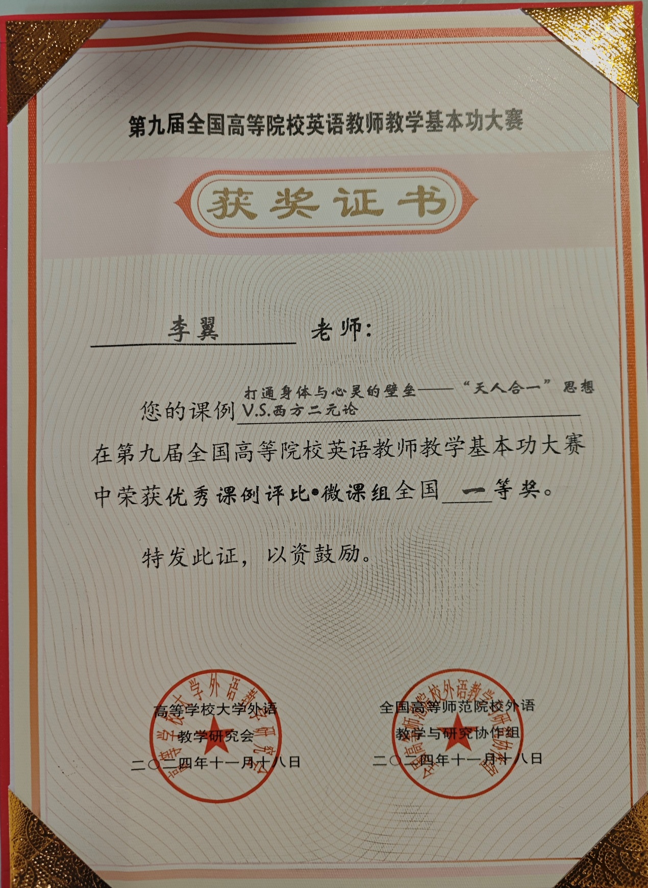 2024年11月18日,全国高等院校英语教学学术年会暨第九届全国高等院校英语教师教学基本功大赛在江城武汉圆满落幕。我校外国语学院英语系专任教师、多语种翻译与国际传播研究中心成员李翼老师在第九届全国高等院校英语教师教学基本功大赛中,凭课例“打通身体与心灵的壁垒——“天人合一”思想V.S. 西方二元论“荣获优秀课例评比·微课组全国一等奖。
