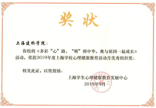 我校申报的《多“彩”心路,“晴”照中华,我与祖国一起成长》荣获2019年度“上海学校心理健康教育活动月”优秀组织奖;《我愿生活在阳光下》获得优秀“心晴”故事二等奖。