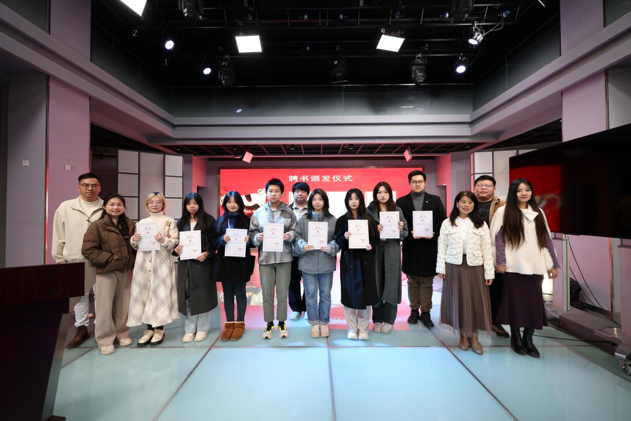 在与会师生的共同见证下,徐磊与奚丽君共同为上海建桥学院校电视台揭牌。同时,奚丽君还为校电视台台长、副台长及各部门部长颁发了聘书。