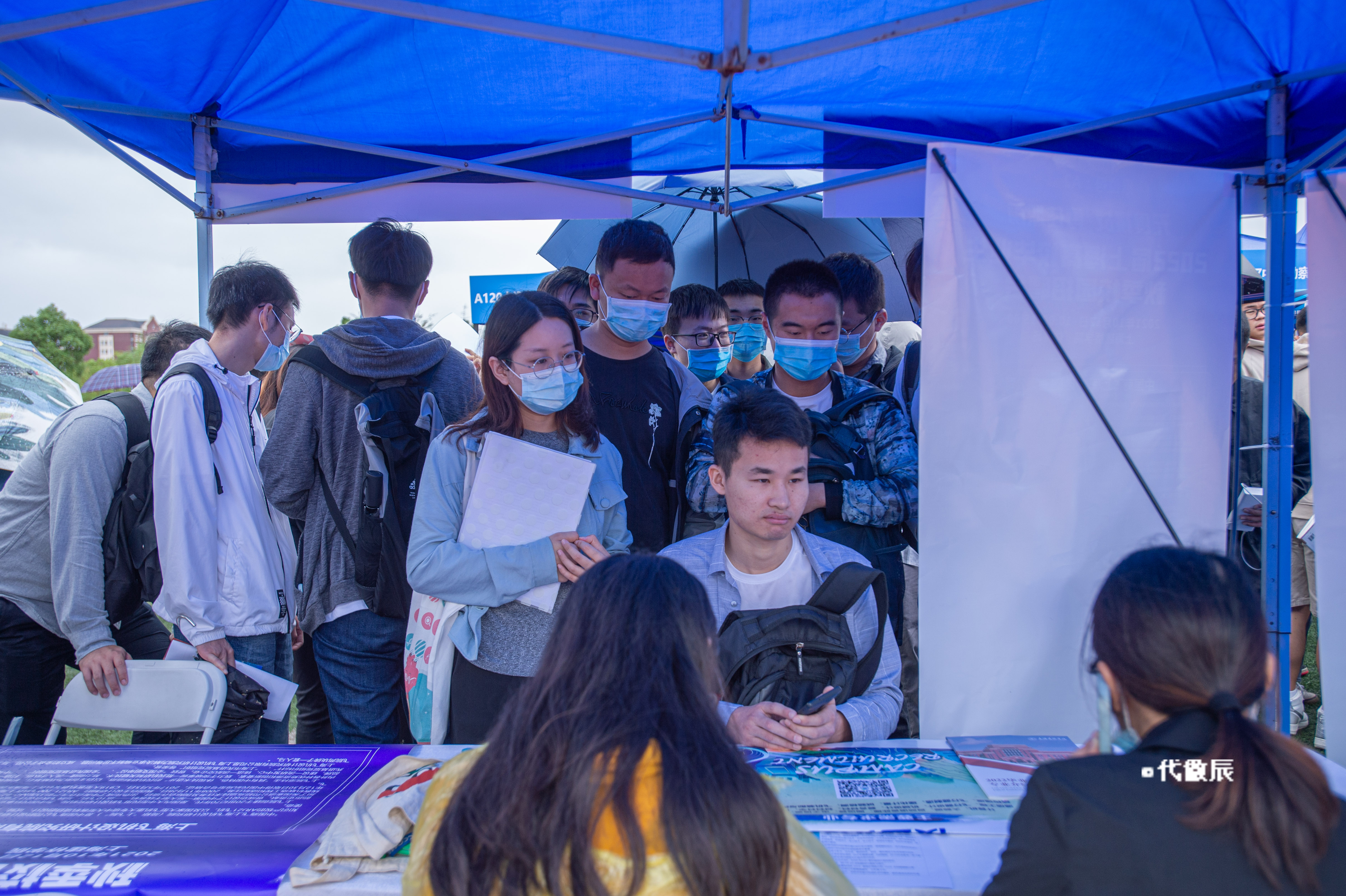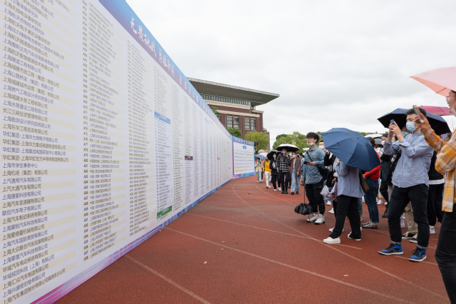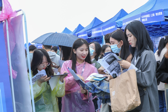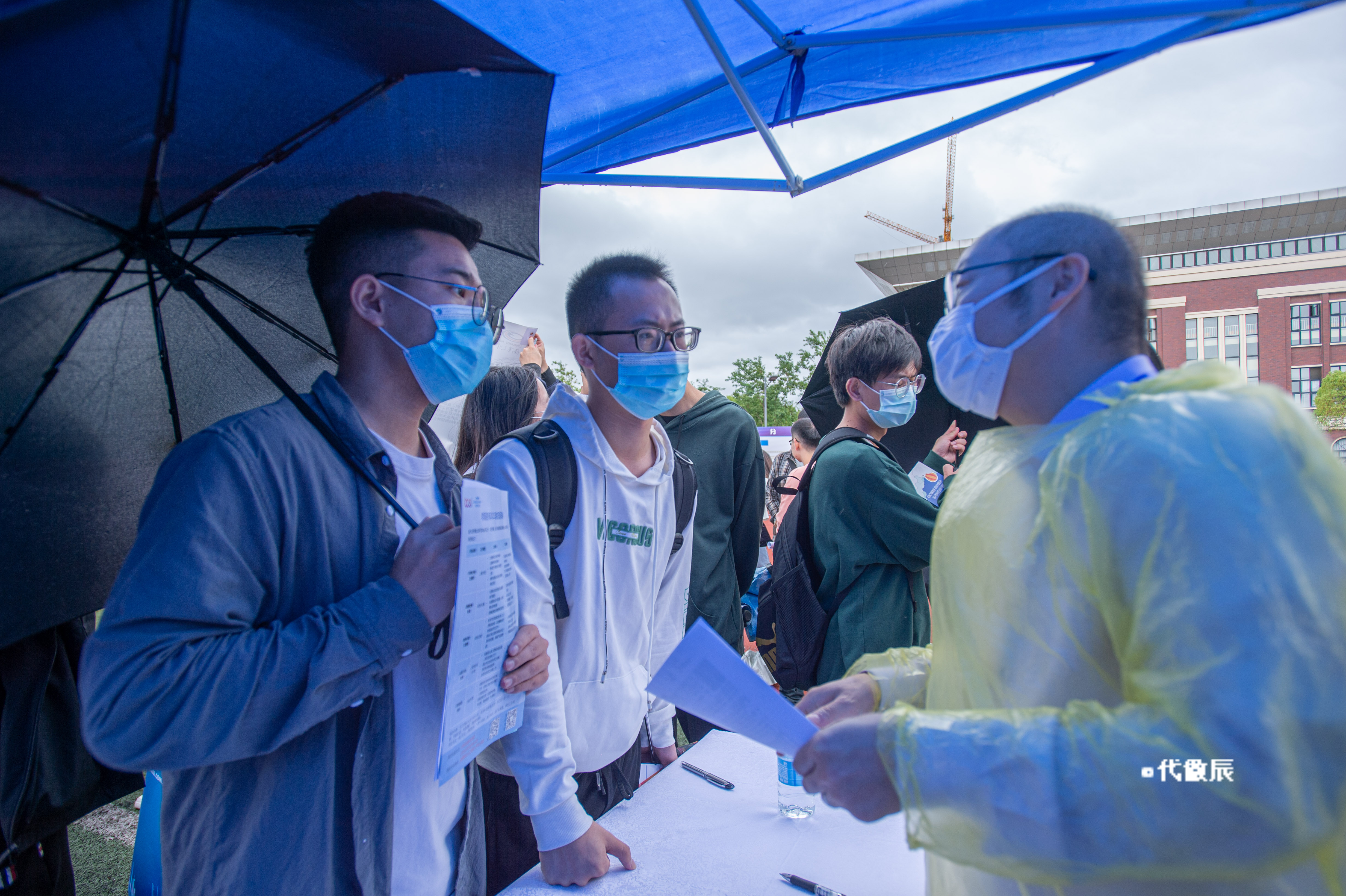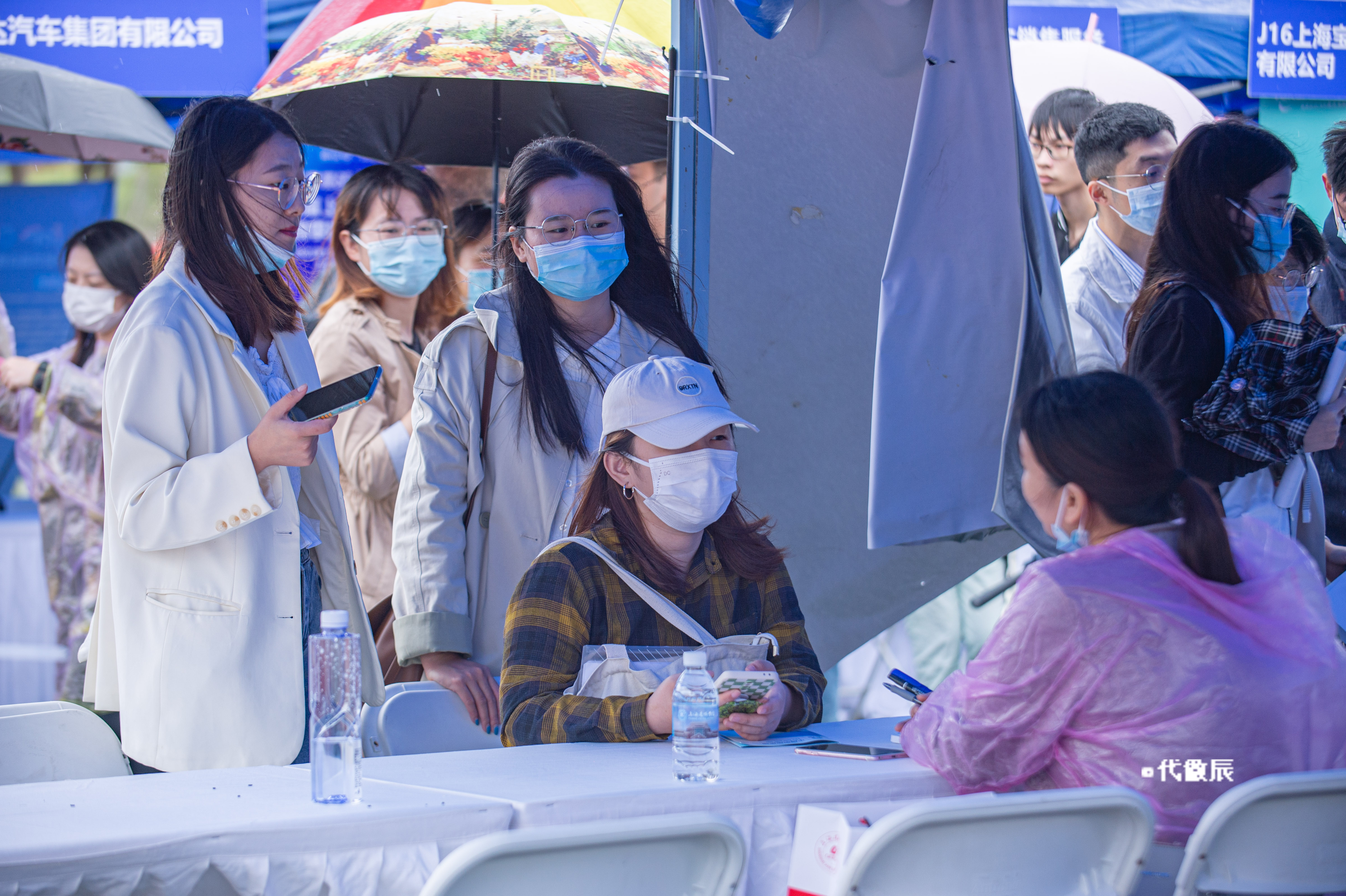 10月12日,线下大招聘,风雨也无阻,2022年应届生的校招早早“位”你而来!当天,名为“无畏挑战 勇往职前”的2022届上海高校毕业生秋季校园招聘会在临港新片区举行。尽管天公不作美,但中国商飞、上汽通用、上港集团、上海电气集团、上海医药集团等980家用人单位均进场招聘,提供岗位2800余个,招聘需求达25000多人。面对秋招良机,沪上14000余名应届学子,纷纷走进上海建桥学院体育场积极应聘。