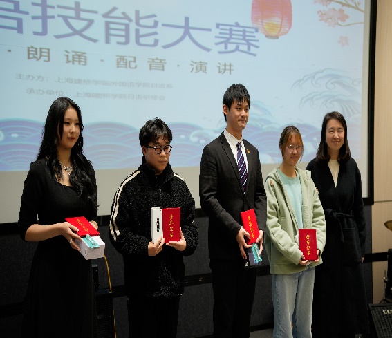 日语系周杨副主任、张文碧副教授与范骏博士为三等奖的获奖选手颁奖。