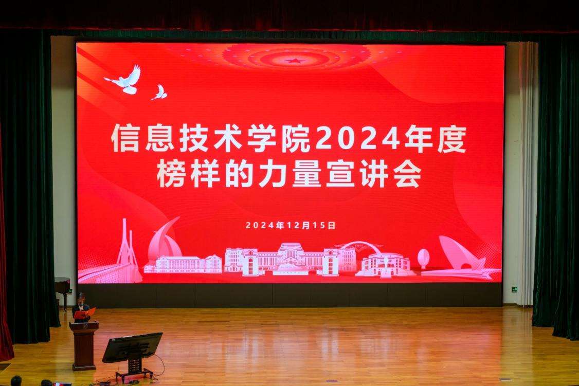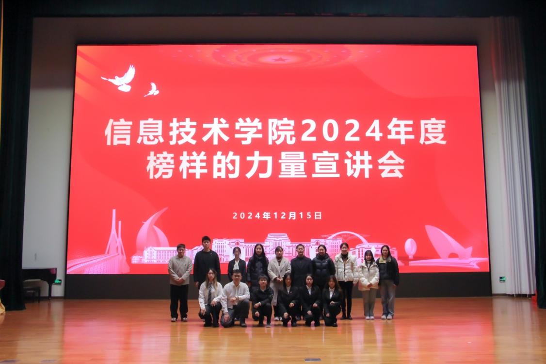 为建设优良的校风学风,塑造良好的校园氛围,帮助2024级新生合理地规划、利用好大学时光,以便同学们更好地度过大学生涯,12月15日晚,信息技术学院在学校大礼堂开展了“榜样的力量”宣讲活动。本次活动,邀请了6名在各方面表现优秀的高年级学生作为嘉宾,向2024级新生分享学习、工作和大学生活经验,解答新同学对大学生活的疑问,为他们点明努力的方向。学院2024级辅导员、易班工作站指导教师,以及全体新生参加了本次活动。