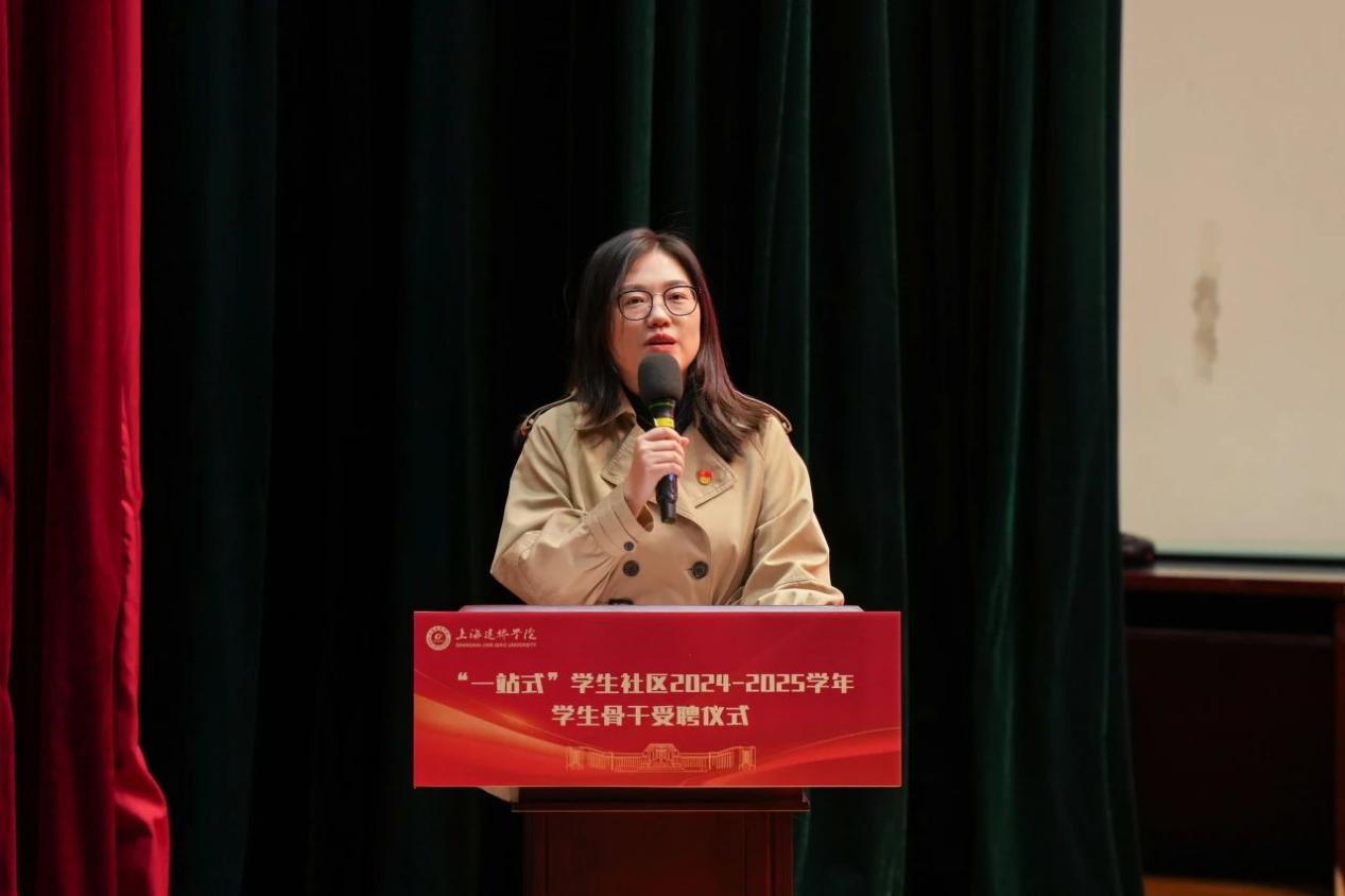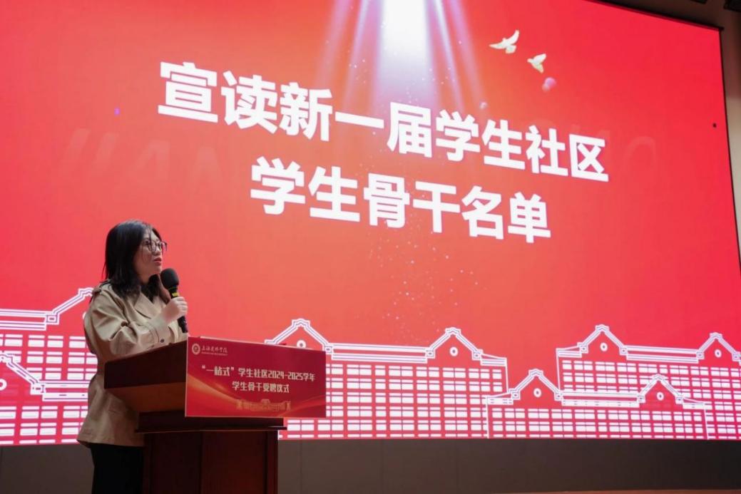 第二项议程,由“一站式”学生社区中心主任高祺宣读2024-2025学年“一站式”学生社区学生骨干名单,她表示:“一站式”学生社区的建设,围绕学生、服务学生、依托学生。自2024年3月至今,“一站式”学生社区中心共吸收了389名学生骨干,其中包含社区党建中心100人、园区党工站53人、楼层长236人。