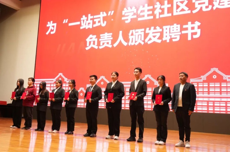 “一站式”学生社区在学生自治、朋辈互助等方面取得的成效,离不开各学生组织负责人的努力。受聘仪式上,“一站式”学生社区中心的老师们为社区党建中心各部门负责人、各园区党工站副站长以及各楼宇楼长颁发聘书,为党建中心干事、党工站干事以及层长佩戴工作牌,希望大家再接再厉,带领各学生组织为社区建设贡献力量。