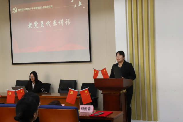 首先,刘爱香书记代表学院党委对新党员同志们表示热烈的祝贺和诚挚的欢迎。刘爱香书表示入党宣誓是政治生命的一个重要里程碑,意味着将肩负起更为重大的责任与使命,鼓励大家将入党作为人生的新起点,不忘初心、牢记使命,在学习、工作和生活中发挥先锋模范作用,努力成为有理想、有本领、有担当的时代新人。同时,对新党员提出了四点要求,一是要坚定理想信念,做对党忠诚的信仰者。要用党的先进理论武装自己的头脑,坚定对马克思主义的信仰、对中国特色社会主义的信念、对实现中华民族伟大复兴的信心。增强“四个意识”、坚定“四个自信”、做到“两个维护”,坚定不移听党话、跟党走。二是要勤奋学习知识,做追求卓越的奋进者。不断适应时代发展需求,拓宽知识领域,提高理论素养和实践能力,以更好地服务人民、服务社会。三是要勇于担当作为,做时代发展的开拓者。作为新时代的青年大学生党员,要积极投身中国式现代化建设,积极参与社会实践、志愿服务等活动,在实践中锻炼提升自己,敢于担当重任,用实际行动诠释共产党员的初心和使命。四是要严守纪律规矩,做廉洁自律的示范者。要时刻牢记自己的党员身份,自觉遵守党的纪律和规矩,自觉接受党组织的教育、管理和监督。充分发挥党员的先锋模范作用,以良好的形象和作风影响身边的同学,带动更多的青年学生积极向上、奋发有为。