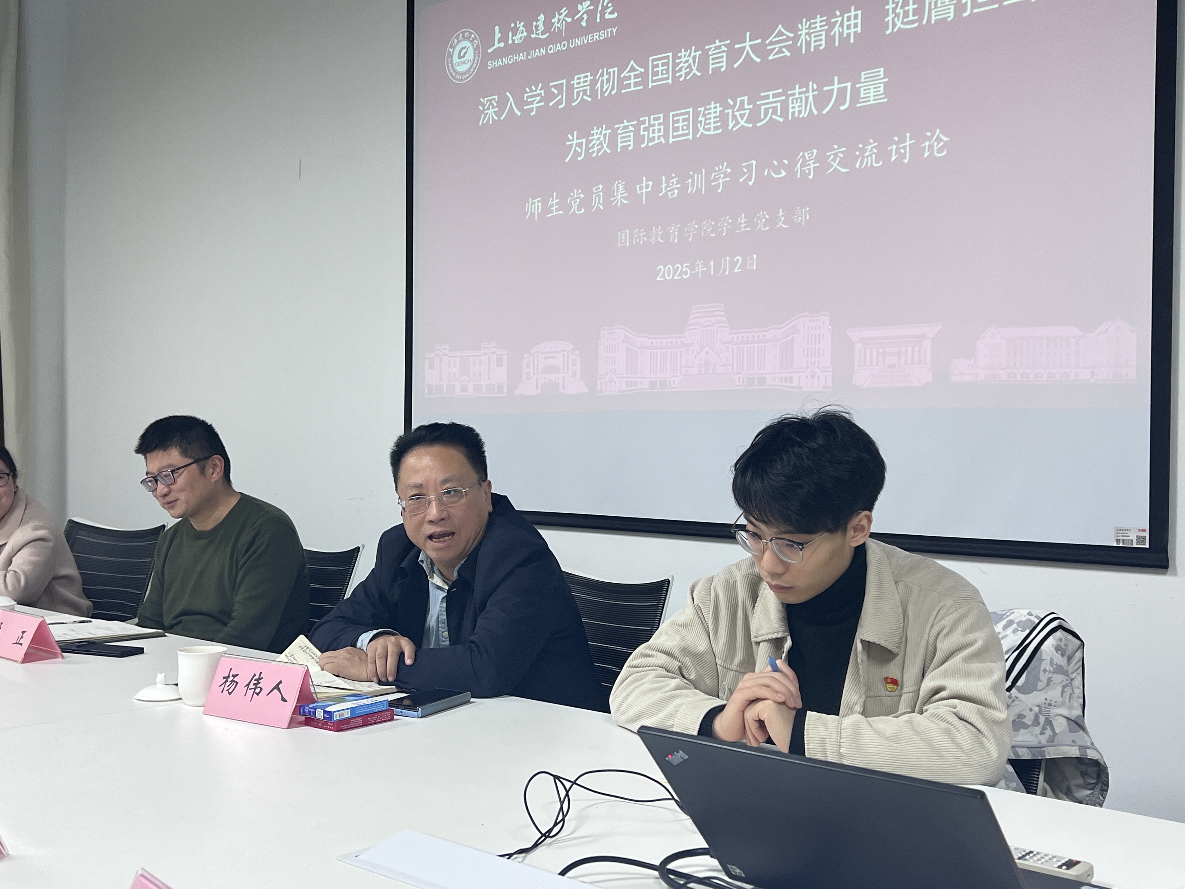 为深入学习贯彻全国教育大会精神,推动教育强国建设,国际教育学院学生党支部在听取教育部怀进鹏部长做的《深入学习贯彻全国教育大会精神,挺膺担当,为教育强国建设贡献力量》专题报告后,于2025年1月2日下午在学院209会议室召开交流研讨会,会议由支部书记杨静主持,支部师生党员参会。校党委书记杨伟人、校宣传部部长桑正莅临指导。