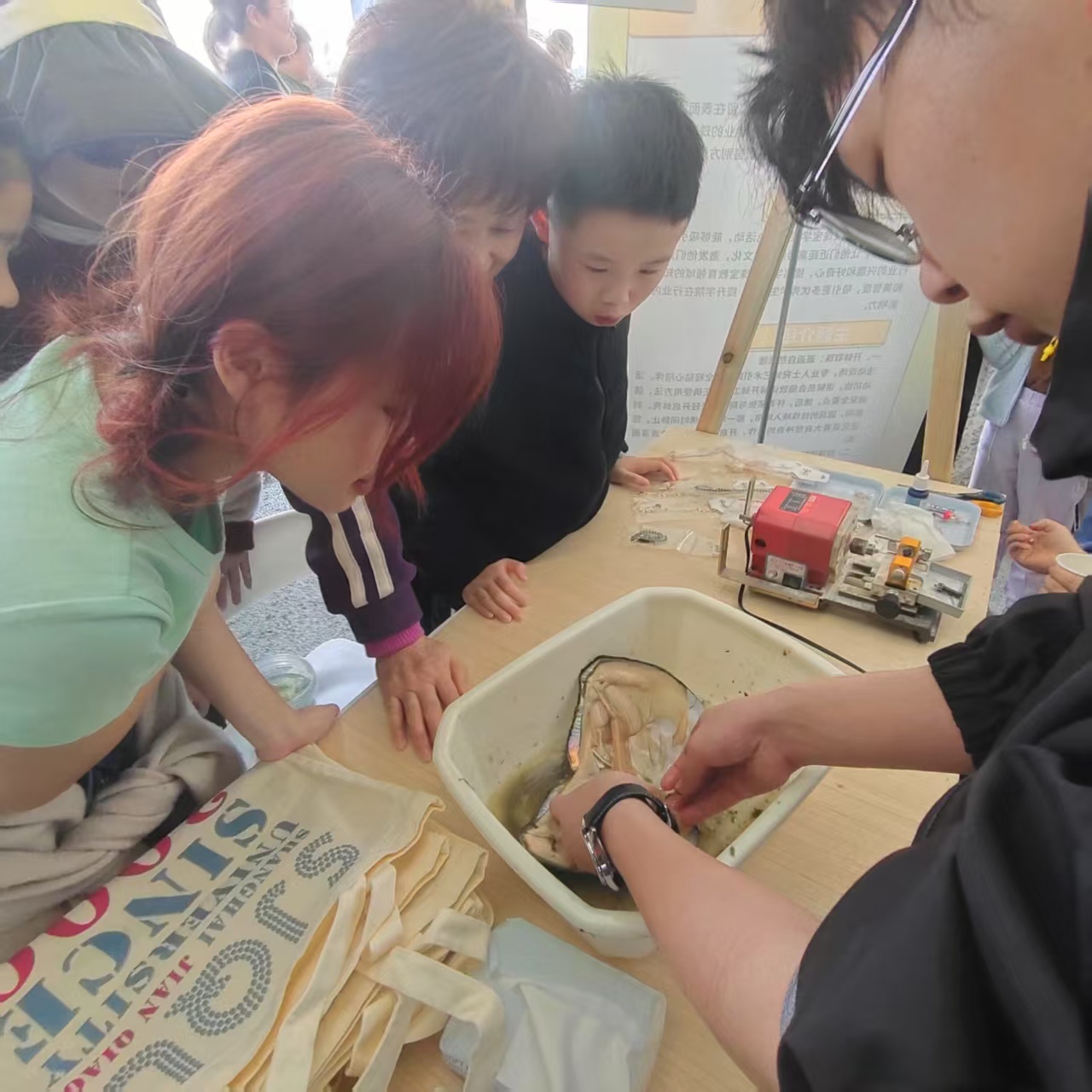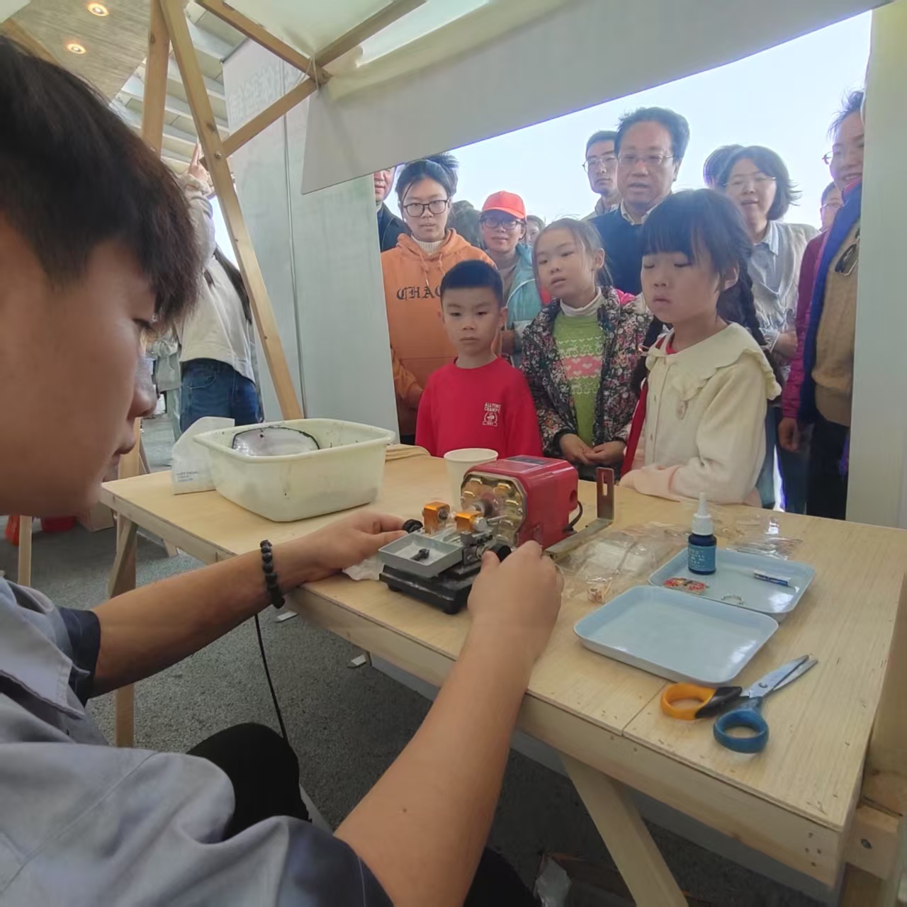 活动现场,志愿者们通过精彩的开蚌取珠实景演示,同步深入讲解珍珠形成原理与养殖技术,让现场观众直观领略自然馈赠的神奇魅力。在演示过程中,观众们纷纷聚拢观看,不时发出惊叹声,对珍珠的形成过程表现出浓厚的兴趣。互动体验环节更是精彩纷呈。志愿者们手把手指导观众进行开蚌取珠的实际操作,让他们亲身感受从蚌中取出珍珠的惊喜。观众们小心翼翼地按照指导操作,当珍珠从蚌中滑落时,脸上洋溢着成就感。