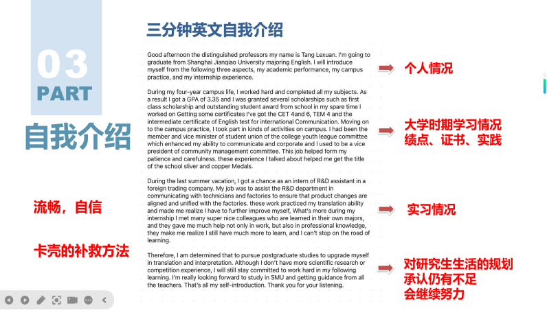随后,陈琛、唐乐萱、汪萍三位优秀校友结合自身经历为大家分享备战考研复试的实战策略。