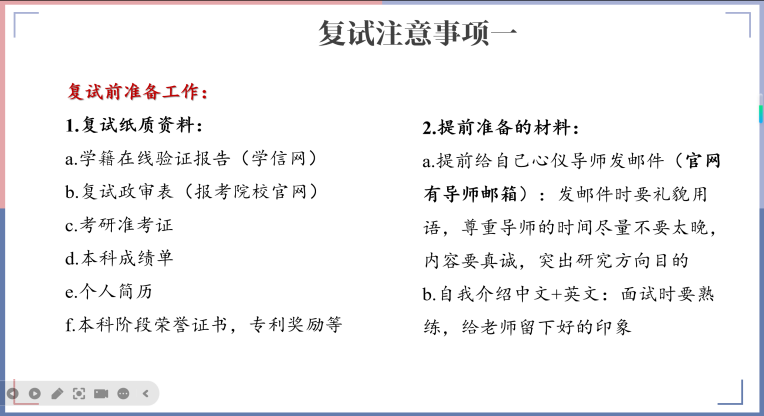 陈琛详细介绍了复试全流程。她指出,面试时要着装得体、举止大方,保持良好的精神面貌;回答问题应逻辑清晰。同时分享了心态调整的经验,她回忆自己复试期间也承受巨大压力,建议大家合理安排时间,制定科学复习计划,避免考前突击导致焦虑,保持积极乐观心态是发挥出最佳水平的关键。