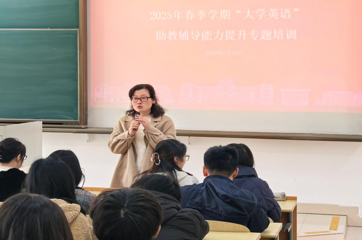为提升2025年春季学期英语助教“小先生”的教学辅导水平,助力大学英语教学工作高质量发展,外国语学院在校学生处的支持下,于3月20日在三教120,组织开展了第5期大学英语助教“小先生”岗前培训。本次培训由大英教师党支部组织委员徐辰老师主持,大英部主任孔辉、大学英语教师党支部书记陈银春、大学英语教师党支部副书记傅荣琳、大英部副主任桂瑞思老师等辅导教师代表,以及来自各学院的英语助教们参加了此次培训。