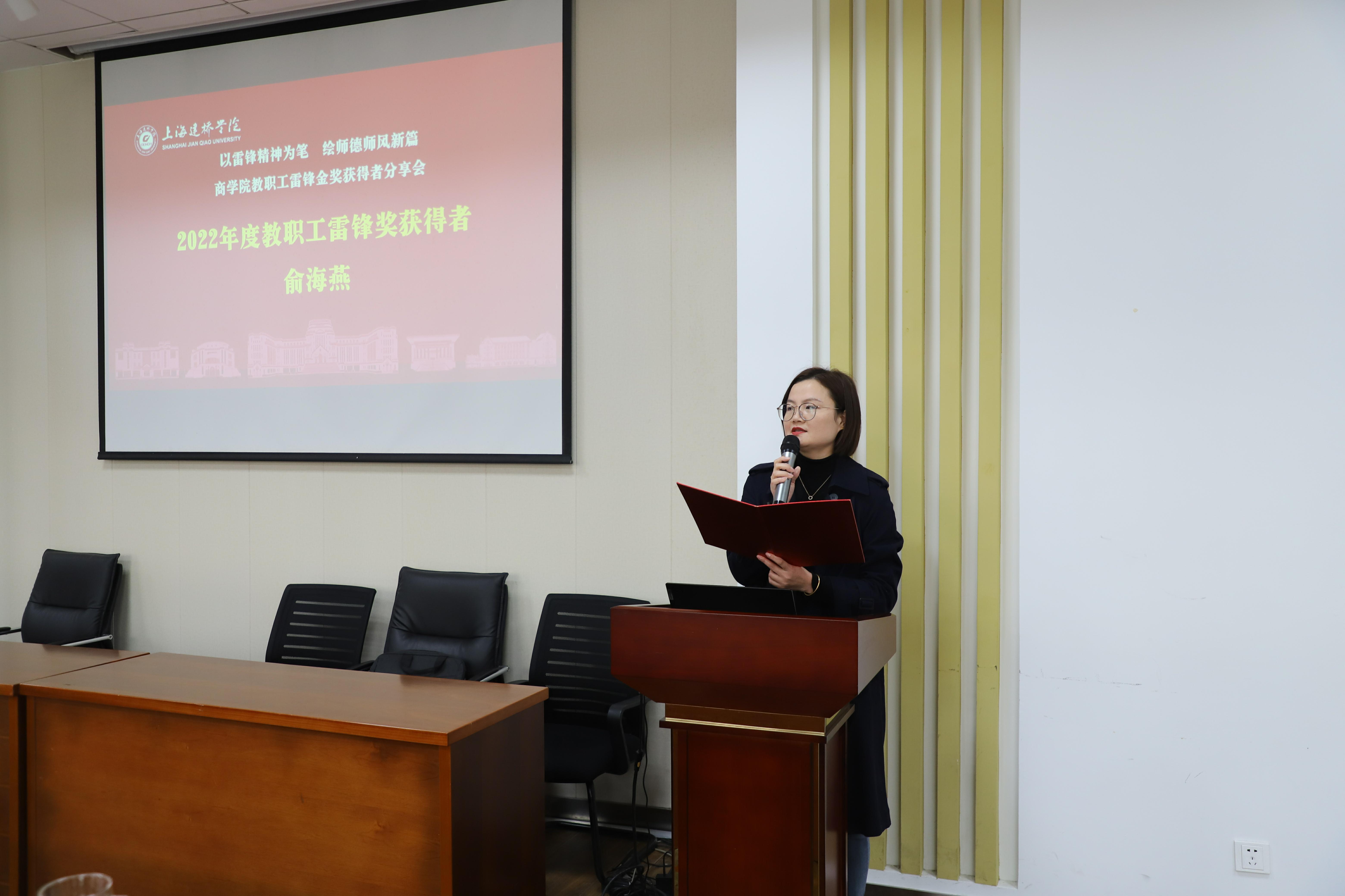 俞海燕老师分享道:荣誉源自责任,雷锋金奖不只属于我个人更属于学院“大家庭”。她分享了自己参加西部计划志愿者、担任思政辅导员以及带领学工团队荣获上海市“巾帼文明岗”一步步的成长经历。表示,“路虽远,行则将至;事虽难,做则必成”,未来将进一步加强学习,坚定信仰,不断提高自己的政治站位,不忘初心,砥砺奋进,坚持用习近平新时代中国特色社会主义思想铸魂育人,更好地担负起学生健康成长的引路人和守护者。