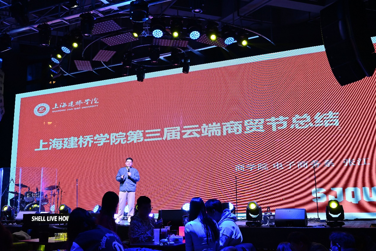 伴随着歌手的弹唱、我校电子商务系系主任张江对第三届上海建桥云端商贸节进行了总结和数据发布、华嗨数科总监时瑞庭进行了电商直播季的活动宣讲、壳live house创始人郭鹏举介绍壳的创业历程。