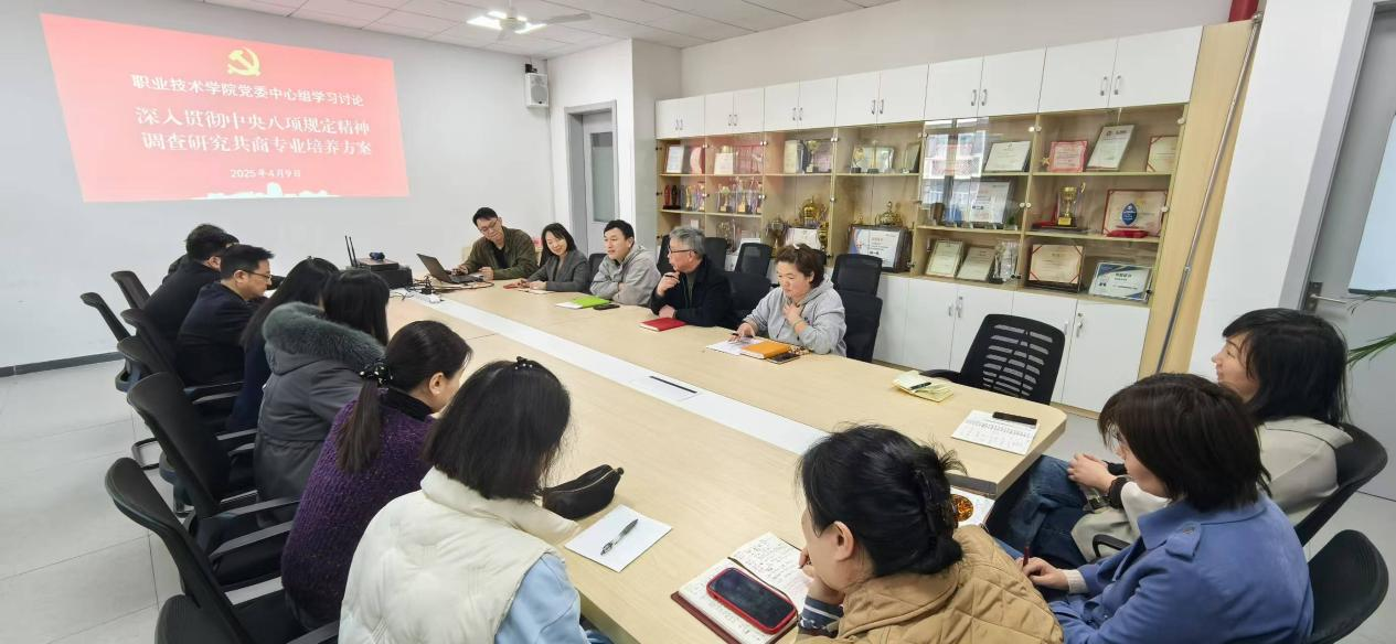 职业技术学院党委中心组于4月9日举行学习会,深入贯彻中央八项规定精神,结合《高职院校办学能力评价实施方案(2025-2030)》文件要求,调查研究议事谋事,共商基于产教融合的专业培养方案,致力于学院教育教学踏上新征程。