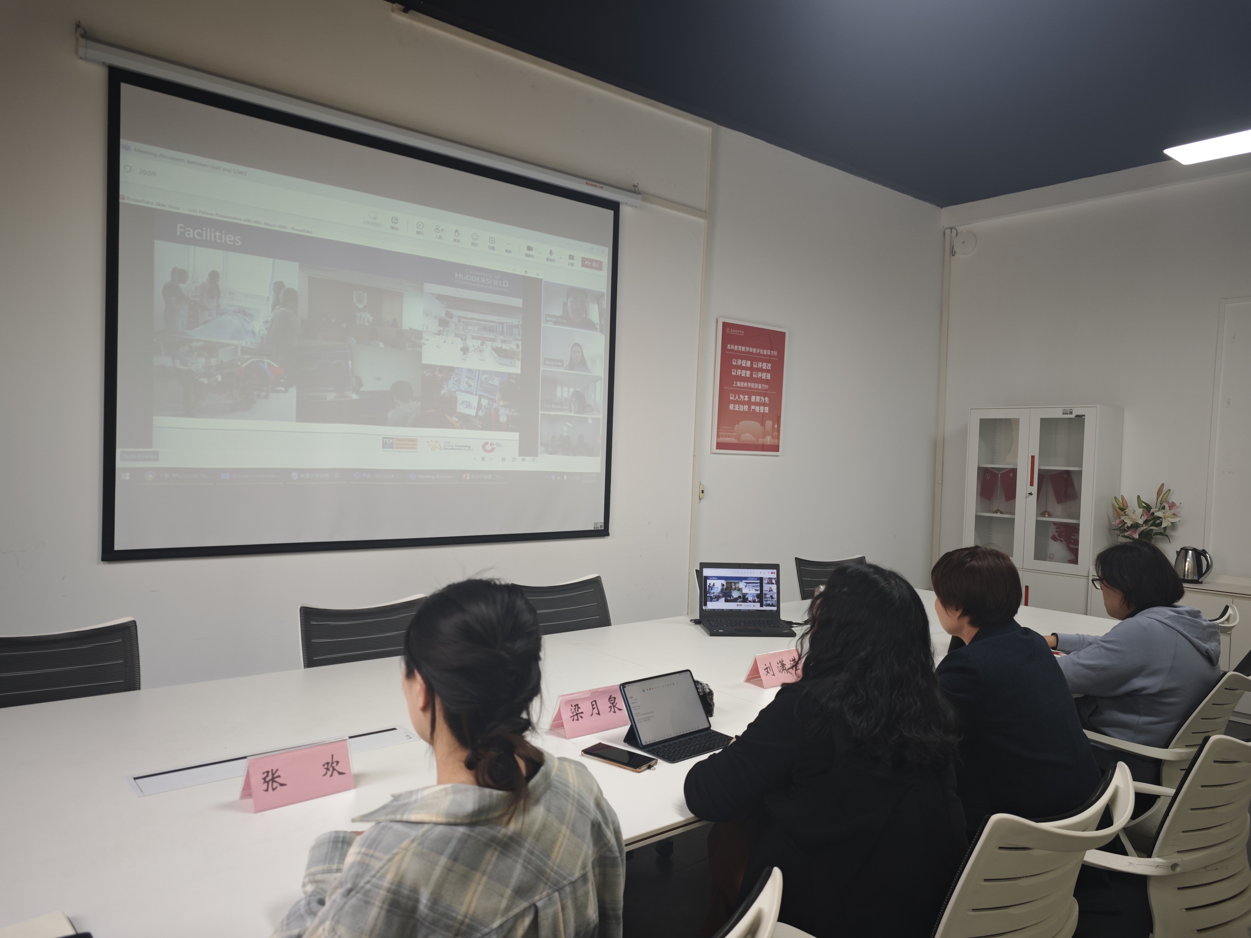 随后,我校对外交流办公室梁月泉主任详细介绍了学校的地理位置、校园面积、专业设置以及在校学生数量,并着重介绍了学校的国际化发展战略。她提到,上海建桥学院一直致力于提升教育国际化水平,希望通过与英国哈德斯菲尔德大学的合作,进一步拓宽学生的国际视野。