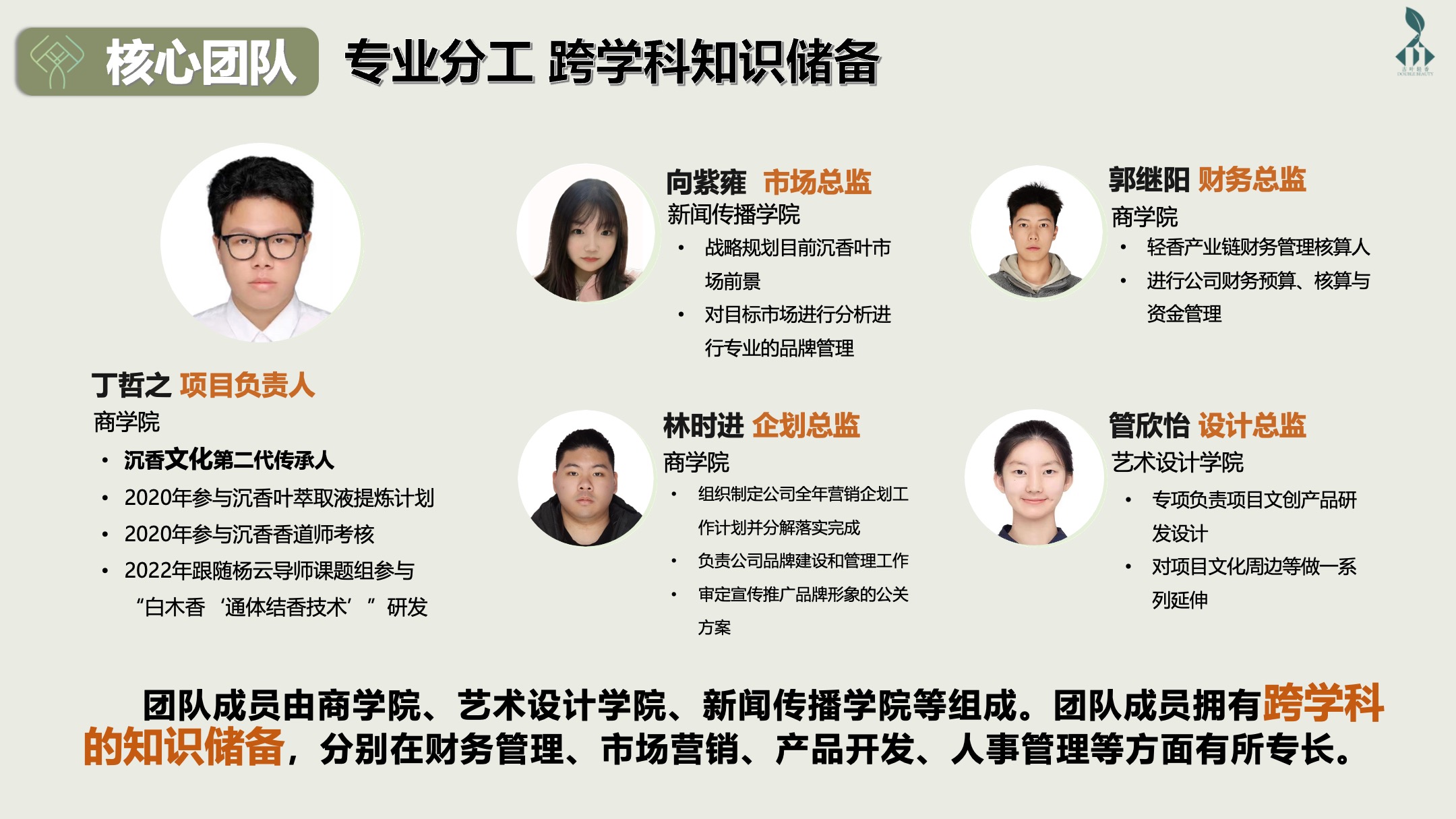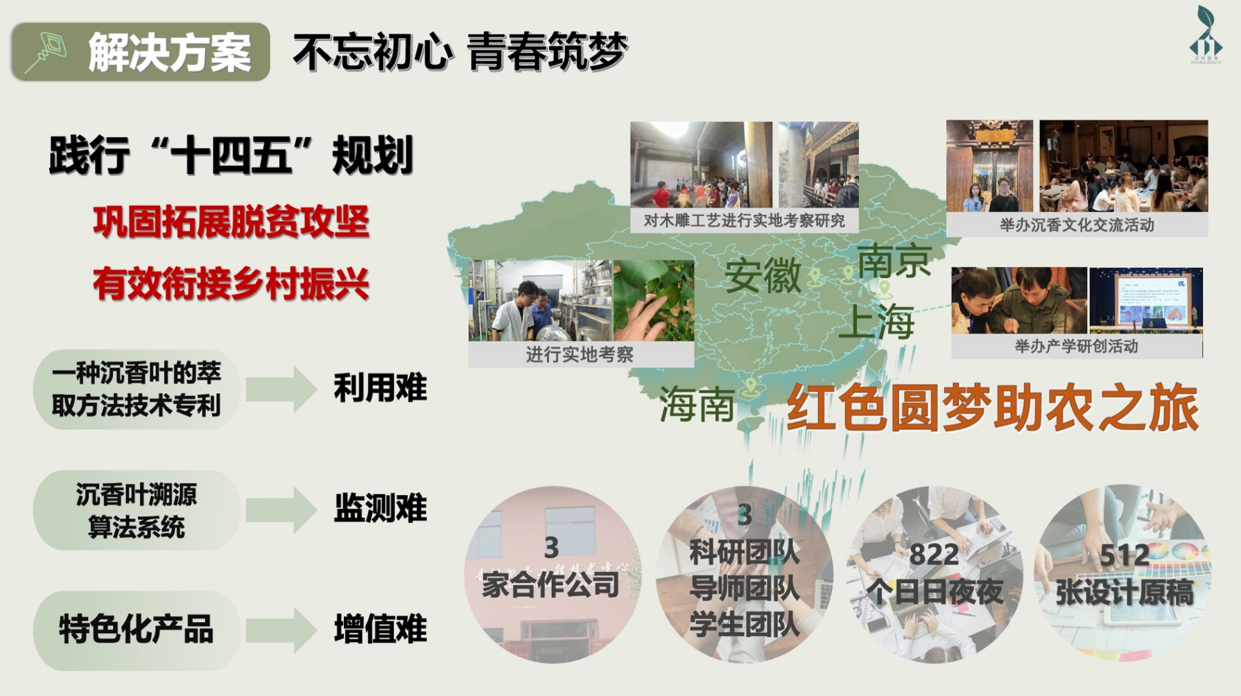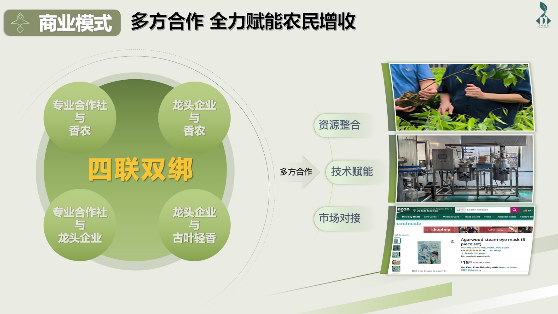 项目组聚焦海南沉香产业痛点——每年超30%的沉香叶因缺乏高值化利用被废弃。团队通过自主研发的专利萃取技术,团队成功开发沉香叶纯露及香膏产品,原料利用率提升至100%,每年可为海南香农增收超3亿元,并通过“8%生态反哺计划”支持沉香胚苗保护,促进生态平衡。 项目独创四联双绑模式:联合政府、合作社、龙头企业和电商平台,构建从种植到销售的闭环生态。核心产品点叶香膏采用废木再生包装,结合红楼梦十二钗国潮设计,通过沉香美人元宇宙IP实现年轻化破圈。项目的目标市场覆盖国内中高端香氛、化妆品及医药领域,并拓展国际市场,填补沉香文化年轻化空缺。采用线上线下双渠道营销:线上通过电商平台、社交媒体直播带货及虚拟AR体验销售;线下布局体验店,结合香旅文化(观景、手作体验)增强品牌感知。 以此最终做到带动当地农民自产、自营、自销、自立、自足,完成赋能乡村振兴。