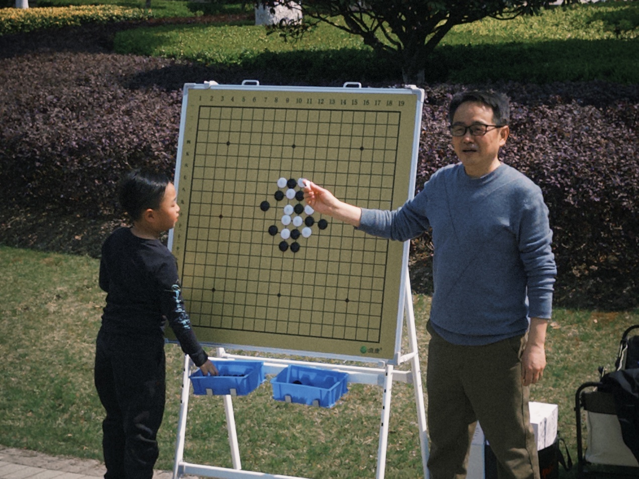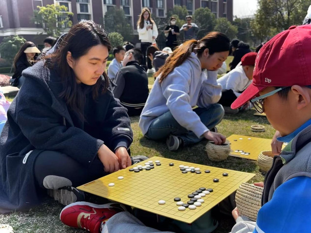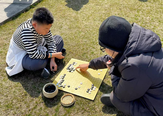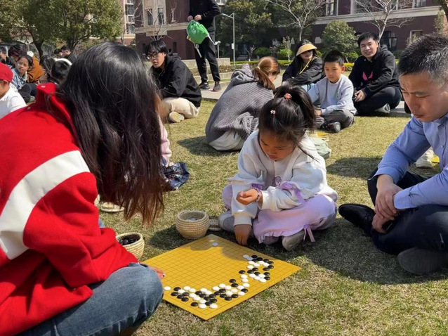 紧张刺激的交流赛中,小棋手们与建桥学院传播学(围棋)专业的学生展开对弈。落子铿锵间,逻辑思维与决策力悄然提升,胜负之外更显棋道礼仪。春日和风里,草坪上洋溢着一种氛围叫“快乐、智慧和松弛”。一名乘坐的轮椅,由爸爸妈妈陪同的小棋手,离开轮椅在草坪上纹枰对坐,观战的父母表情透漏出一种幸福的力量。