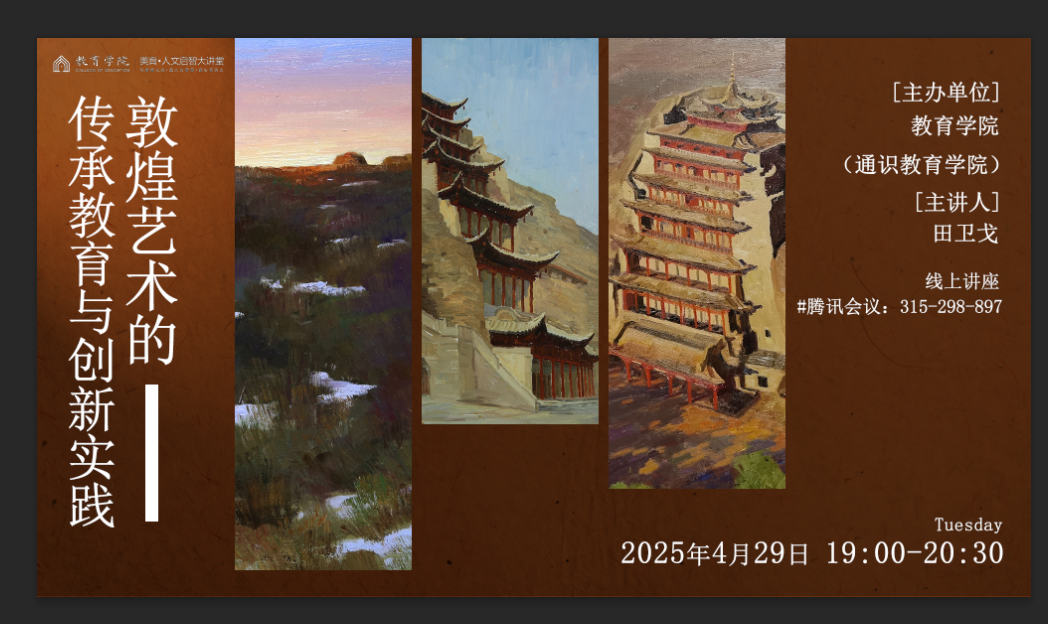 4月29日晚,教育学院(通识教育学院)举办第五期“美育人文启智大讲堂”线上讲座《千年学堂:敦煌艺术的传承教育与创新实践》。西北师范大学教授、敦煌艺术研究与教育专家田卫戈教授,带领全校师生走进莫高窟的艺术世界,开启了一场关于历史、文化与教育的深度探索。