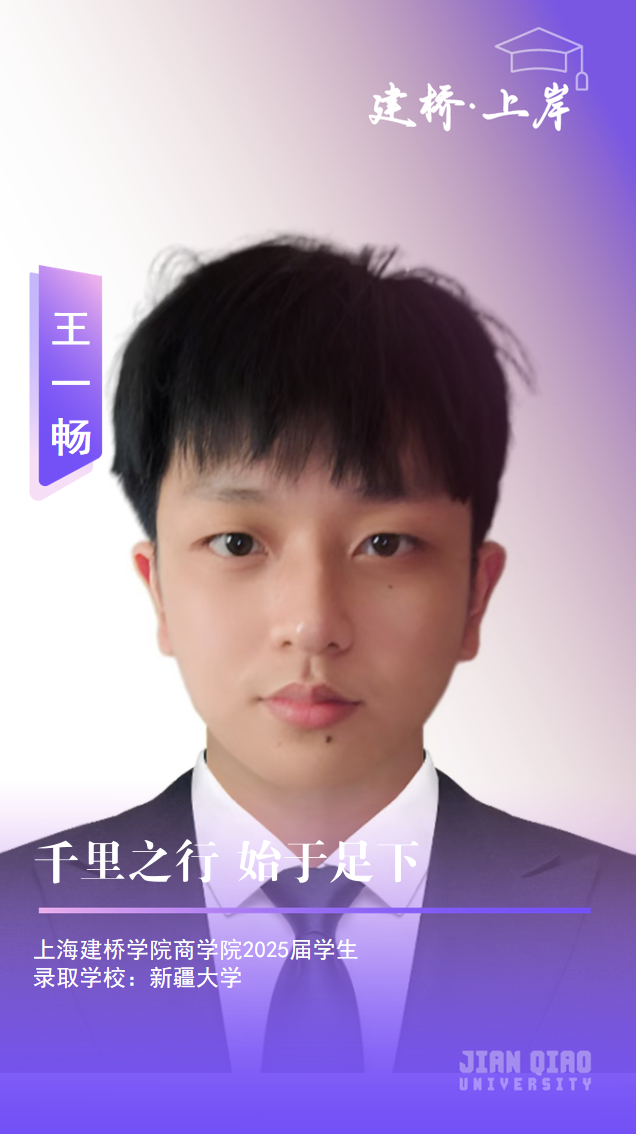 个人简介:王一畅,上海建桥学院商学院2025届毕业生,今年以优异成绩考取新疆大学工业工程与管理专业全日制硕士研究生。在校期间曾荣获上海工程技术大学程创杯银奖,十五届技能节一等奖,十七届全国大学生智能汽车竞赛校赛三等奖等荣誉称号。