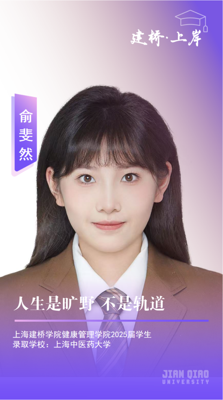 个人简介:俞斐然,上海建桥学院健康管理学院健康服务与管理专业2025届毕业生,以优异成绩考取上海中医药大学公共卫生专业硕士研究生。在校期间曾获校级特等奖学金1次、一等奖学金1次、二等奖学金1次;2023年第二届“寻康杯”全国大学生健康管理情景模拟沙盘大赛二等奖;曾任校民乐团团长、健康管理学院分团委学生会办公室部负责人、《疾病学基础》课程助教。