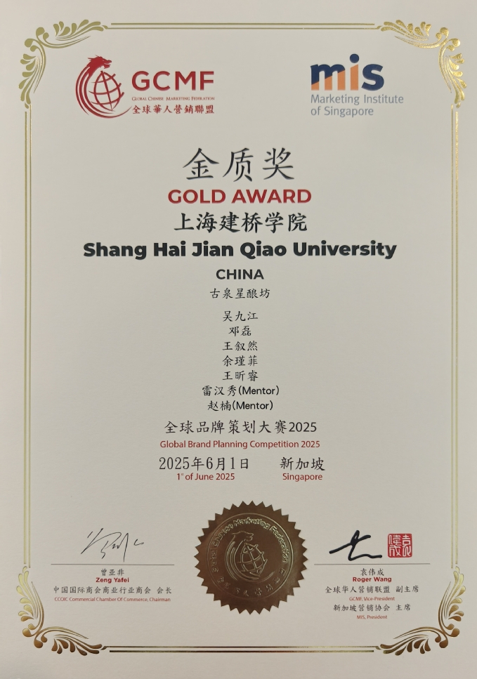 62新加坡刚刚落幕的2025年全球品牌策划大赛决赛中,上海建桥学院商学院古泉星酿坊学生团队,从全球众多顶尖参赛队伍中力克群雄,一举摘得赛事最高荣誉——金奖。这一历史性突破,不仅是我校学子首次在该国际顶级商科竞赛中勇夺桂冠更是学校应用型人才培养卓越实力的闪亮证明。