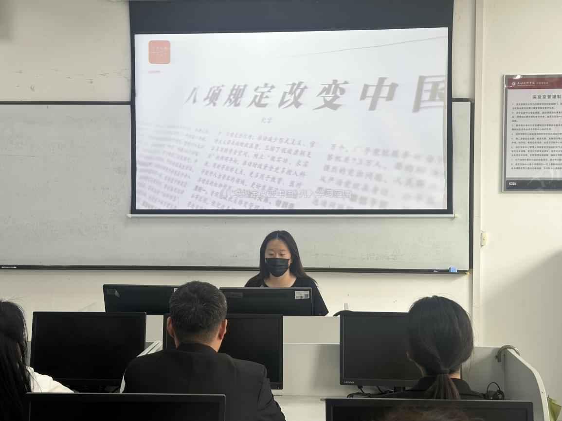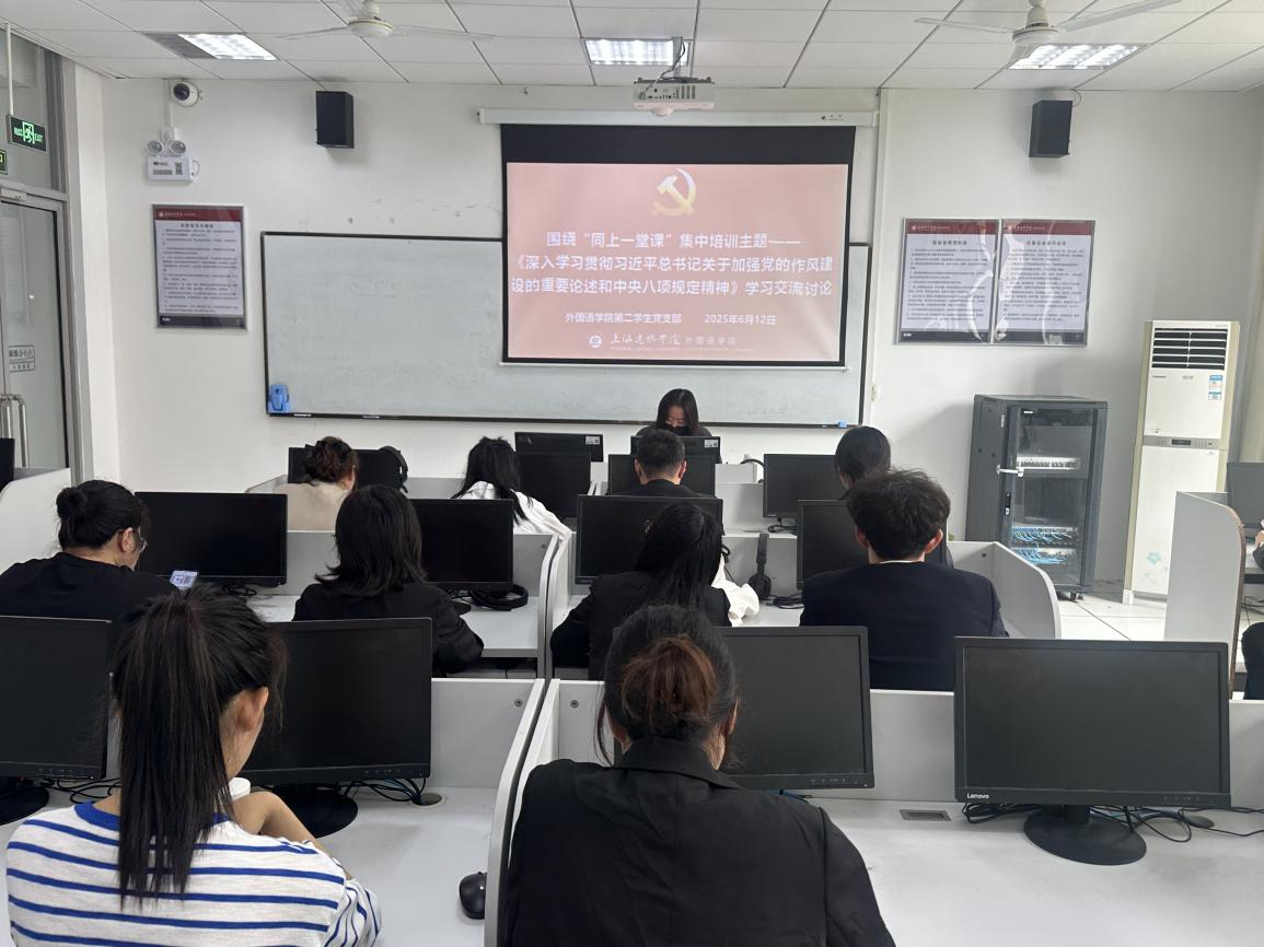为深入学习贯彻中央八项规定精神,外国语学院第二学生党支部于6月12日在学院314开展专题学习,会议围绕“同上一堂课”集中培训主题《学习贯彻习近平总书记关于加强党的作风建设的重要论述和中央八项规定精神》以及《八项规定改变中国》开展学习交流讨论。会议由支部组织委员(主持工作)孟娣主持,支部全体党员参会。