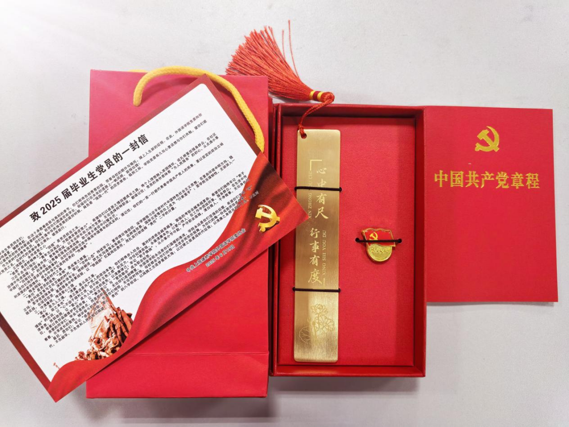 党委副书记伊莉代表学院为毕业生党员赠送了,学院为他们精心设计了一份“毕业生党员礼盒”,内含党徽、党章、廉洁标尺和致毕业生党员的一封信。党徽,是“第一身份”的烙印;党章,是党员的行动指南;廉洁标尺上“心中有尺,行事有度”的箴言,是对党员们廉洁自律的警醒;而学院给毕业生党员的信,则承载着学院对党员同志们的深切嘱托与期许。这份赠礼,不仅饱含了学院的深情厚谊与美好祝福,更是一套寓意深刻的“精神行囊”。党徽是身份的象征,党章是行动的准则,廉洁标尺是行为的戒尺,而学院的嘱托信则是温暖的勉励。它们共同构成了对毕业生党员坚定理想信念、强化纪律意识、永葆清廉底色、勇担时代使命的深切期许和郑重托付。