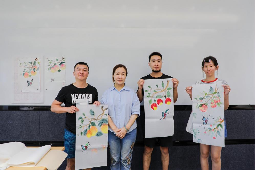 袁蓓老师以中国国画入手,学习水墨和颜料创作,注重意境和气韵表达。描绘自然景物的过程中,学员们用简约的线条、大块的透亮彩墨描绘夏日盛开的荷花,用柔和的调色画出夏季蔬果“水蜜桃”,接触到中国画特有学习用具的学员们表示很新奇,深刻体验中国书画魅力的同时,对于自己运用独特的绘画方式创作的成果也倍感自豪。后续课程将进行文创绘画,让学员们将心灵融入到书画艺术之中,感受中华传统文化的瑰宝。