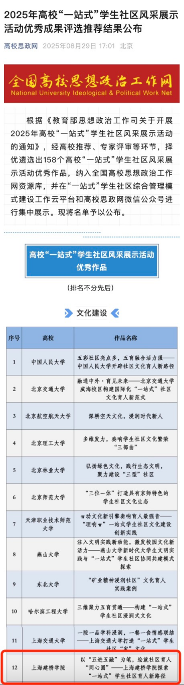 近日,教育部思想政治工作司公布了2025年高校“一站式”学生社区风采展示活动优秀作品名单。本次风采展示活动涵盖党建引领、队伍入驻、学生参与、文化建设、数字赋能、条件保障六个方面,经高校推荐、专家评审等环节,全国共遴选出158个优秀作品,我校《以“五进五融”为笔,绘就社区育人“同心圆”——上海建桥学院探索“一站式”学生社区育人新路径》成功入选优秀作品。