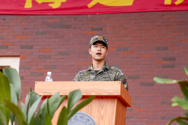军训旅八营二十二连辅导员张灿宇代表随训教师发言,勉励同学们勇敢面对军训中的困难与挑战,珍惜军训时光,把汗水和努力化作成长的印记,在未来的学习生活中不断突破自我、追求卓越。