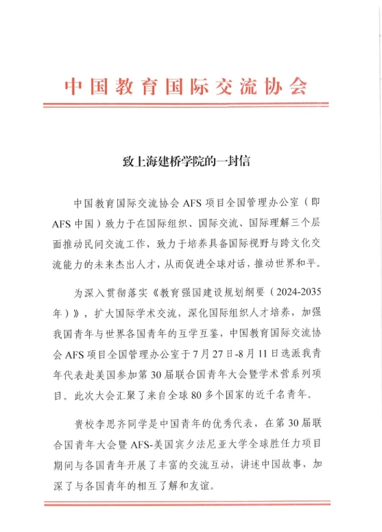 信中表扬了我校李思齐同学的优异表现,对她圆满完成项目表示祝贺并诚邀我校师生持续关注AFS国际文化交流项目,向世界展示可亲、可敬、可爱的中国形象!这封信既是对我校国际化人才培育工作的认可,也是对我校师生参与国际文化交流活动,拓展国际视野的激励。