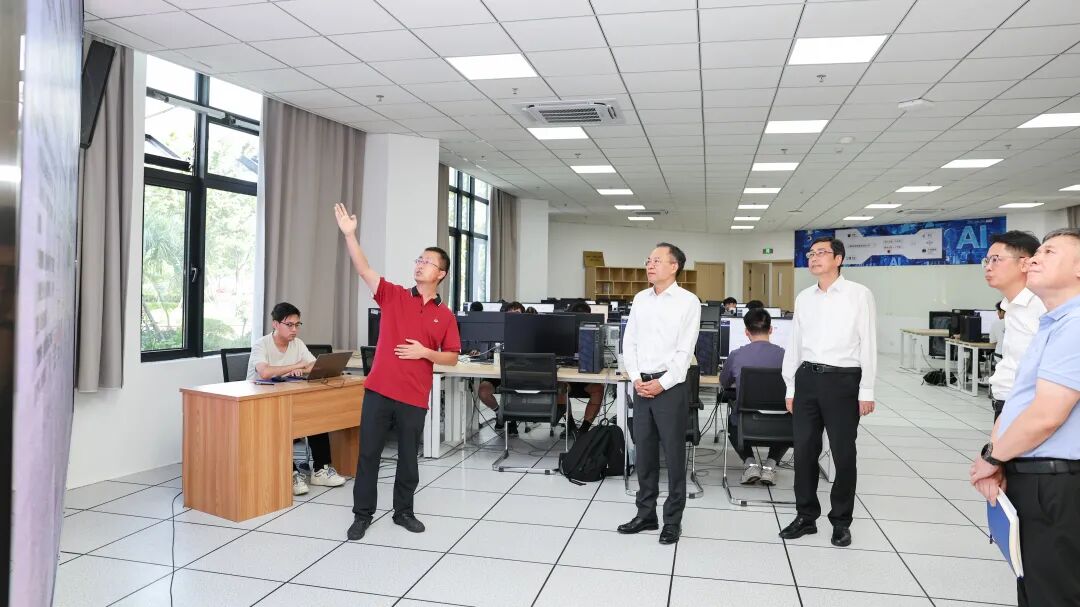 在大数据产业学院,陈金山详细了解学校与本地数据企业合作情况。他指出,要继续推进教育供给侧改革,紧密结合企业需求,利用好临港人才政策,让企业招得到人、留得下来。
