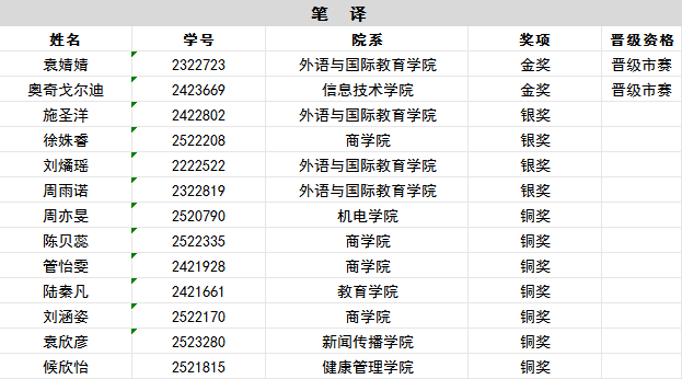 此次校赛选手整体表现突出,综合能力赛中,他们精准解读中国发展成就,流畅翻译中国特色话语体系术语;笔译环节中,实现汉英双向转换的精准传递,展现出从“语言翻译”到“文化传播”的素养跨越,体现了新时代大学生对当代中国的深刻理解与跨文化沟通的自觉意识,充分呼应了“培养有家国情怀、有全球视野、有专业本领的国际化人才”的赛事宗旨。经过激烈角逐,综合能力赛项共评选出金奖3名、银奖7名、铜奖11;笔译赛项共评选出金奖2名、银奖4名、铜奖7名(具体名单见下文)。所有选手的详细得分成绩已在选手QQ群内公布。按成绩分数排序,综合能力排名前四、笔译排名前二的选手,将按赛事要求推荐参加上海赛区市赛。