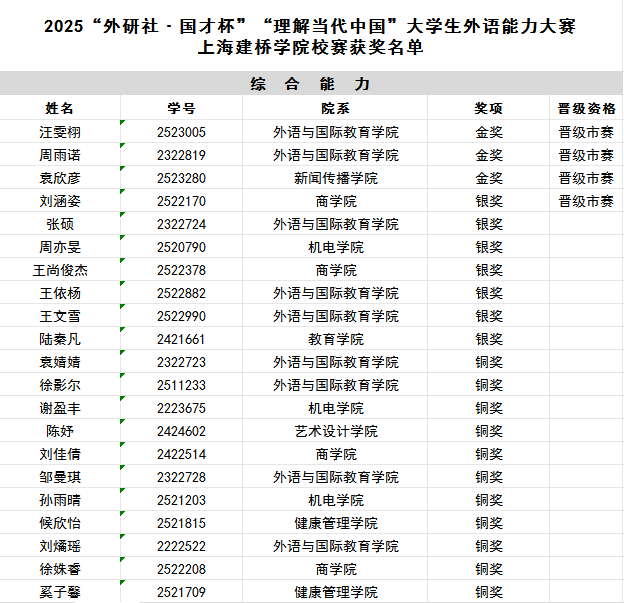 10月12日,2025“外研社・国才杯”“理解当代中国”全国大学生外语能力大赛上海建桥学院校赛工作圆满结束,赛事结果正式揭晓。本次校赛由外语与国际教育学院组织,严格遵循全国赛事标准,设综合能力、笔译两大赛项,吸引全校各专业数百名学子踊跃报名,展现出建桥学子扎实的外语功底与深厚的家国情怀。