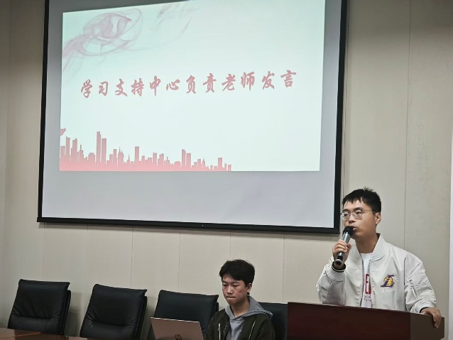 会议的第二项议程,由25级新助教代表发言,25级数学总助教刘可尧同学从为什么选择助教、对助教的认知、工作规划等方面分享了自己的思考与期望,他提到,之所以选择成为助教,是希望能够将这份爱心和知识传递给更多的新生。最后,他呼吁所有新助教秉持“朋辈帮扶,薪火相传”的精神,做一名合格的“小老师”。