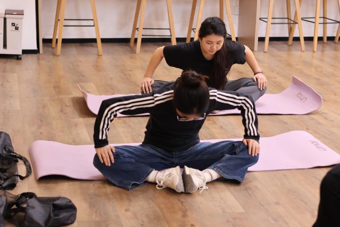 10月22日,中国舞《云絮轻舞》课程率先拉开帷幕。教育学院薛文兰小导师以工作室“零基础友好”的教学理念为指引,围绕中国舞核心的“提、沉”元素,结合呼吸节奏示范腰部起伏动作,“吸气时肩膀下沉、腰部自然上提,呼气时缓慢放松下沉,动作要像云朵飘动般连贯柔和”,细致的讲解搭配手把手指导,让零基础学员快速找到身体发力点。课程尾声,导师带领学员串联简短的手臂延伸片段,将体态与身韵动作初步融合,学员们在缓慢舒展的动作中,真切体会到中国舞的古典雅韵,课堂氛围宁静而专注。