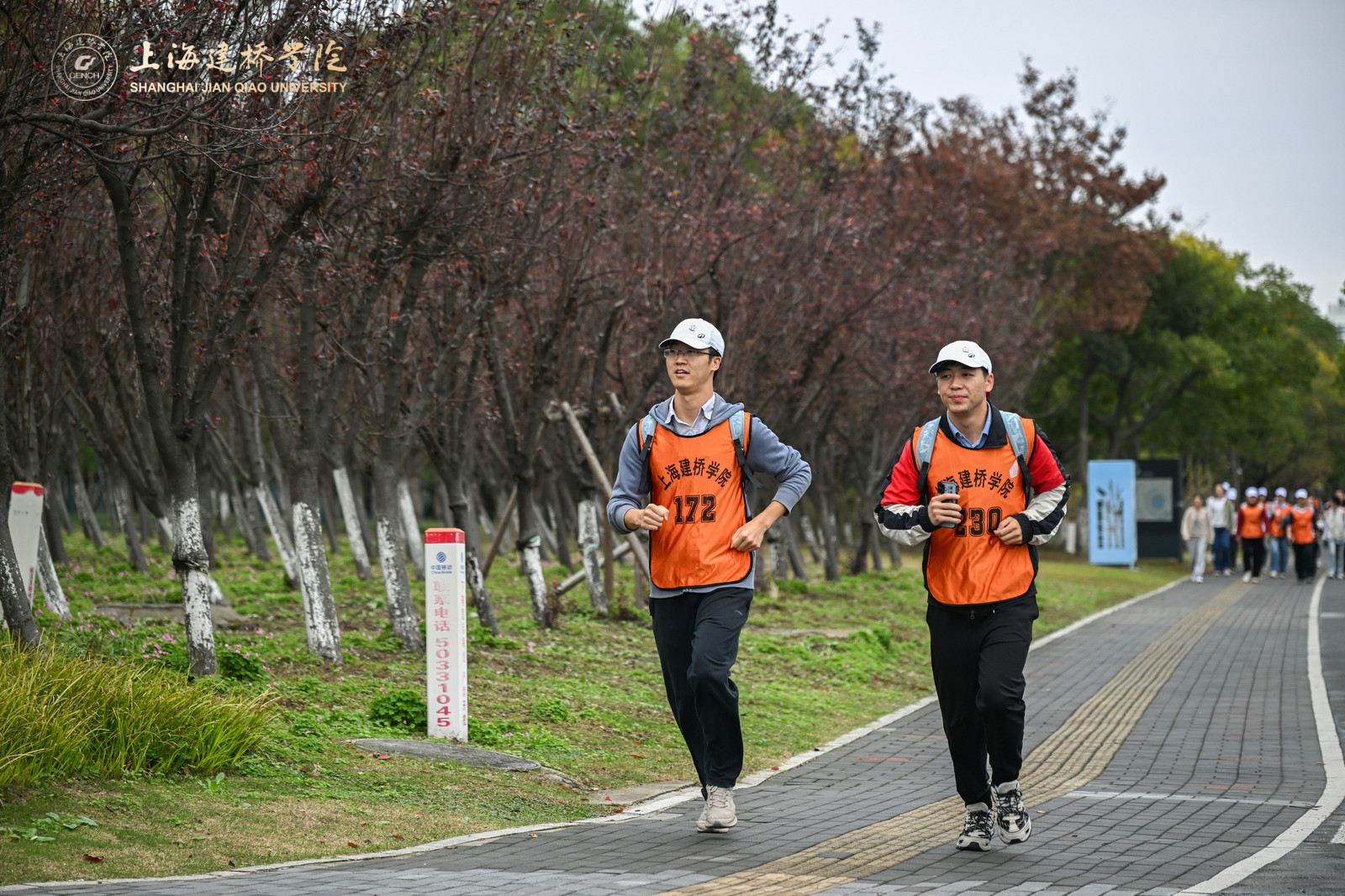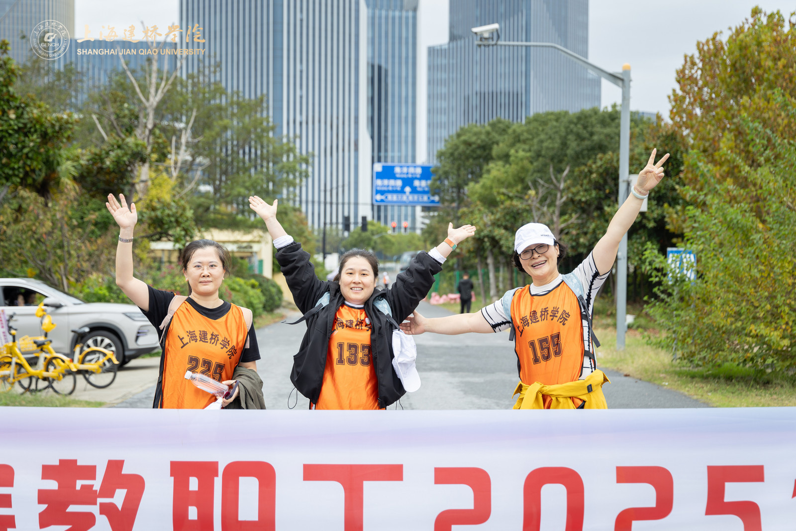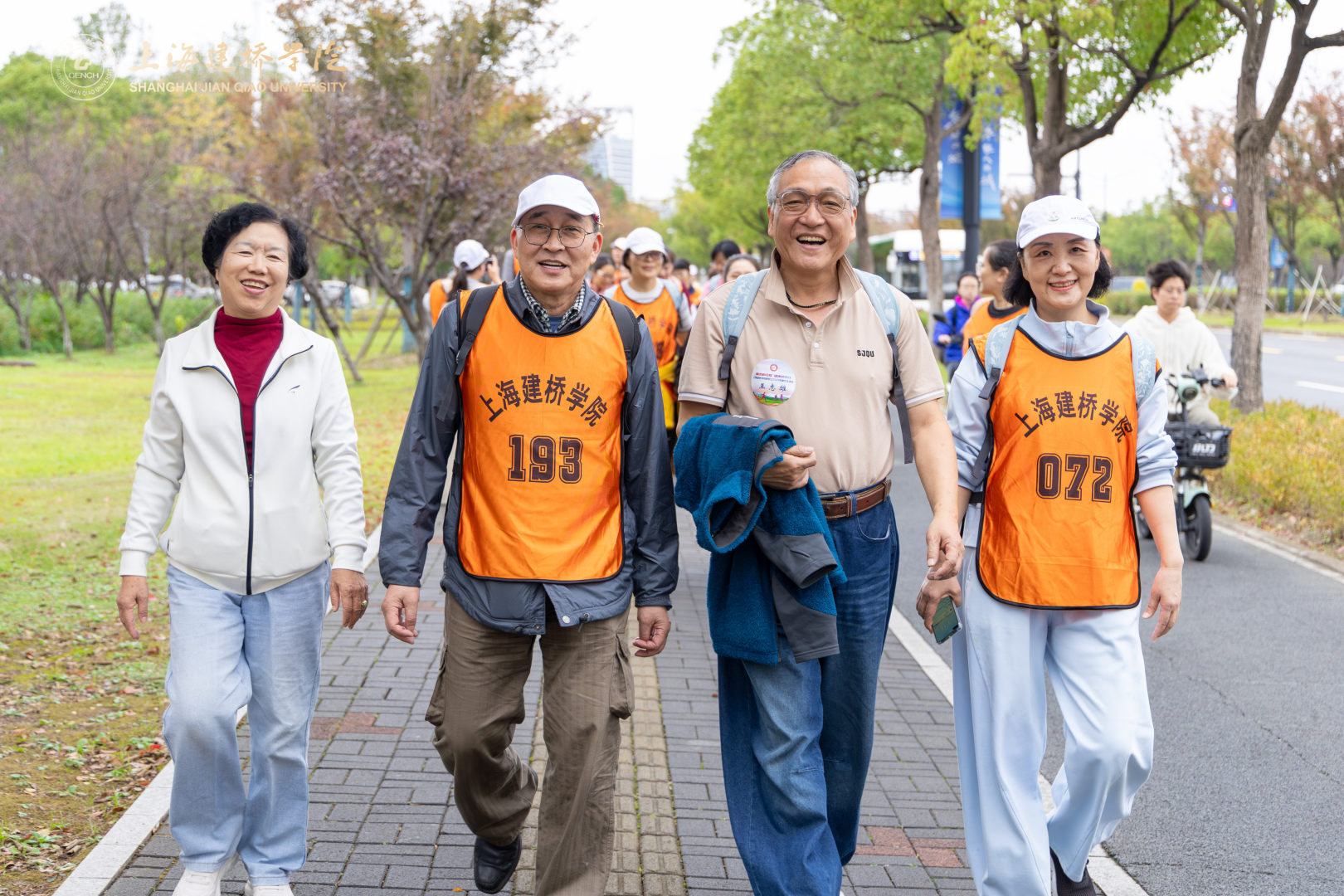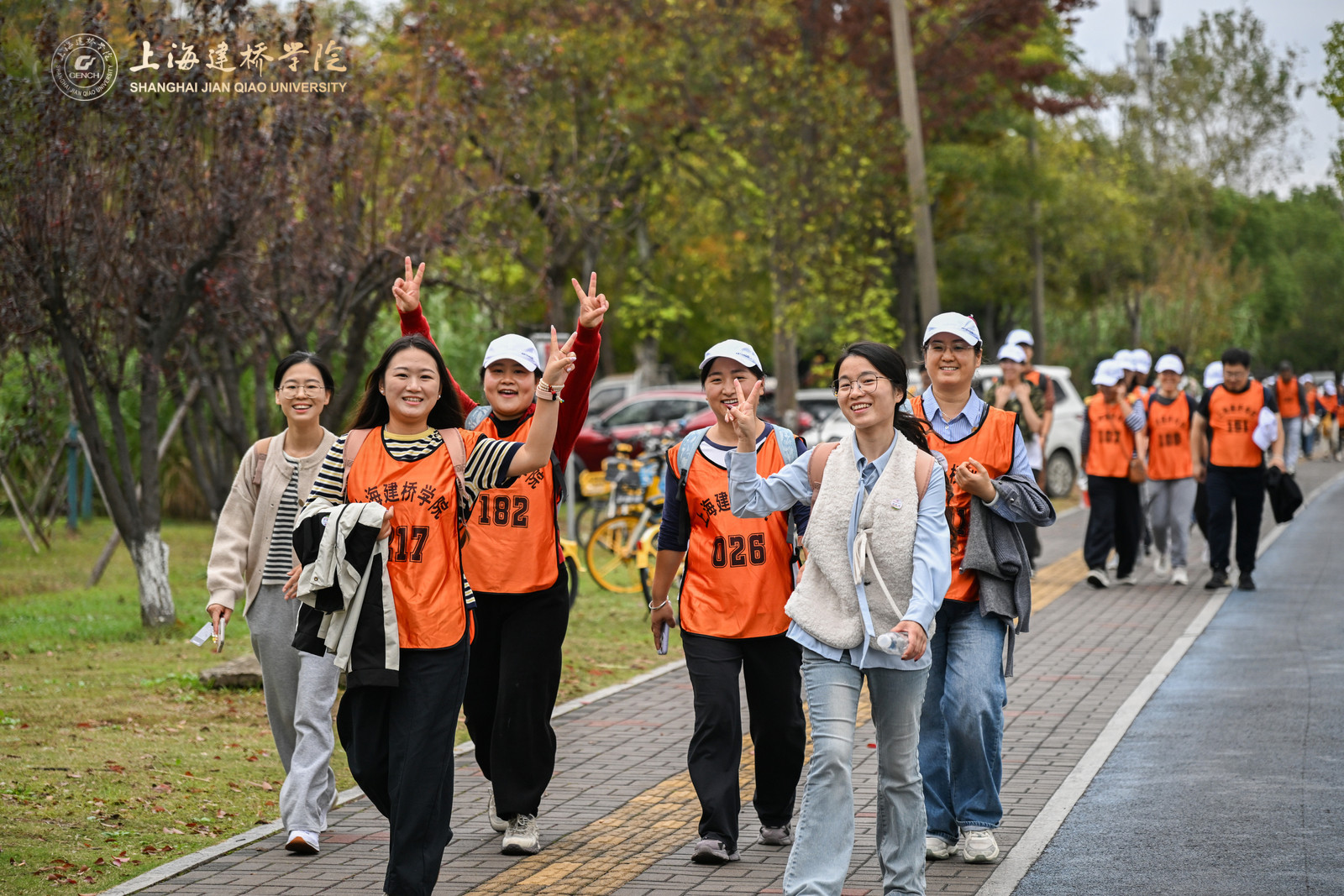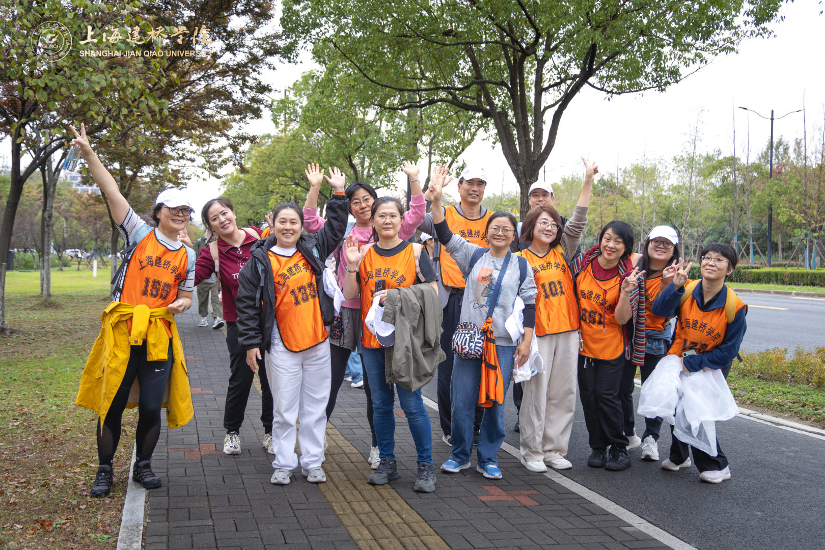 在健步走热身环节,体育部赵龙龙老师带领全体参与者进行了八段锦热身。参赛选手们按分工会为组别依次出发,穿着印有“上海建桥学院”标识的橙色马甲,穿梭于秋色斑斓的树荫大道,形成一道流动的风景线。队伍沿途经橄榄路、沪城环路、海港大道,海基六路,见证海洋大学、海事大学、海立方、信息飞鱼园区、智能网联汽车综合测试示范区等临港现代化地标,全程6.3公里。道路两侧层林尽染,树叶在秋风中沙沙作响,与教职工们的欢声笑语交织成一曲动人的秋日交响。
