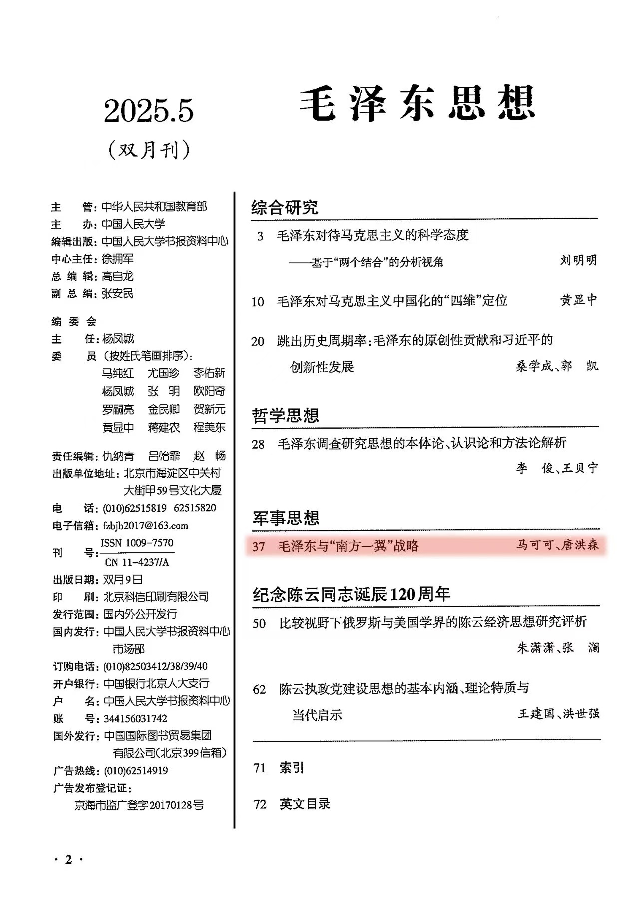 近日,马克思主义学院马可可、唐洪森两位老师撰写的论文《毛泽东与“南方一翼”战略》被中国人民大学复印报刊资料《毛泽东思想》全文转载,原文来自于《观察与思考》2025年第7期,共计21000余字。本文也是唐洪森教授主持的国家社会科学基金后期资助项目“抗战胜利前夕中共中央实施‘南方一翼’新战略研究”(20FDJB003)的阶段性成果。