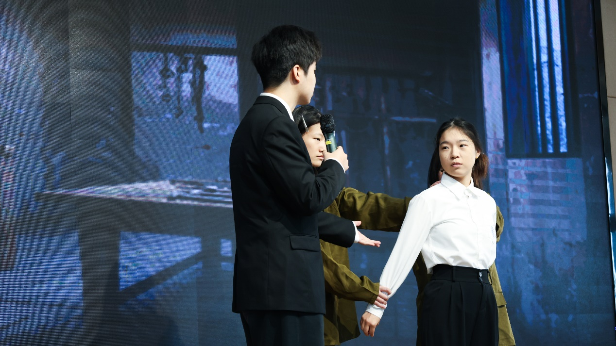 上海中学东校高一6班邵明奕同学用抑扬顿挫的声音诗诵了《致敬杨靖宇》的诗歌,全场报以热烈掌声,表达了大中小学生无比敬仰英雄的心情。商学院封高怡、王鑫垚、严嘉俊四位同学用情景剧的形式展现出了抗日女英雄舍小家为大家、英勇就义的陈康容的伟大形象,表演生动,情感真切,深深感动了现场师生。