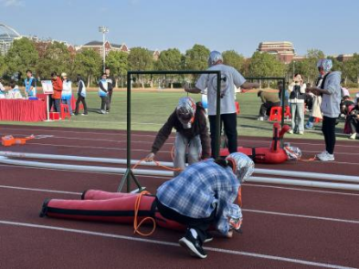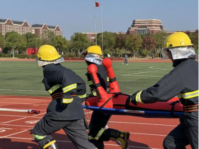 关键时刻,第三项四人综合救援环节成为反超的决胜战场!新闻传播学院参赛队迅速调整状态,退役士兵队员精准把控水枪角度,领队统筹协调分工,整个团队衔接零缝隙、动作快准稳。开水枪时精准命中靶心,抬担架时平稳无晃动,全程争分夺秒,也不忘“不到最后一刻都不能松懈”,将团队协作与应急处置能力展现得淋漓尽致。从暂时落后到步步追赶,再到最终实现反超逆袭,队员们用连贯高效的操作将团队协作与应急处置能力推向顶峰。吴书记与曹老师在赛场边全程关注,不时用眼神与手势为队员们加油鼓劲,现场掌声与呐喊声交织回荡。