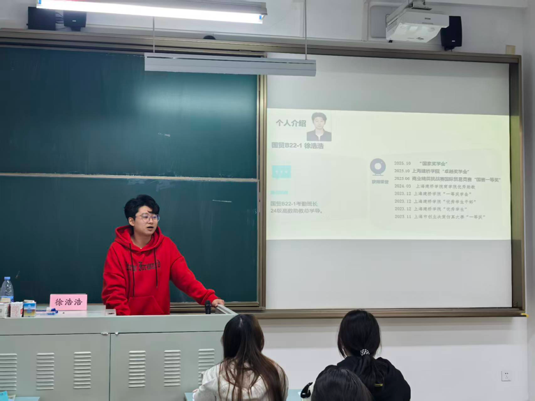 讲座伊始,25级数学总助教吴优同学向同学们介绍了徐浩浩同学,作为国贸B22-1班考勤班长、24级数学总助教,他不仅累计绩点达到了3.83,更斩获国家奖学金,上海建桥学院卓越奖学金,以及商业精英挑战赛国赛一等奖、上海市创业决策仿真大赛一等奖等多项荣誉。徐浩浩丰富的经历与亮眼的成绩,让现场同学迅速产生共鸣,为讲座奠定了良好的互动基础。