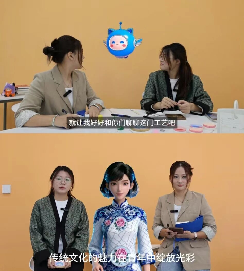 贾兵兵组作品以国家级非物质文化遗产——景泰蓝掐丝珐琅为艺术表达对象,为这项古老技艺“量身定制”了数字代言人和虚拟主播。形象设计借鉴景泰蓝工艺中的纹样设计和色彩体系,借由AIGC技术,通过虚拟主播、数字分身和真人出镜的方式,将静态的非遗之美转化为动态的叙事影像,在虚实交融中传递出文化传承的当代价值。